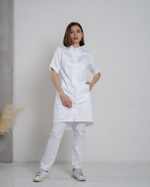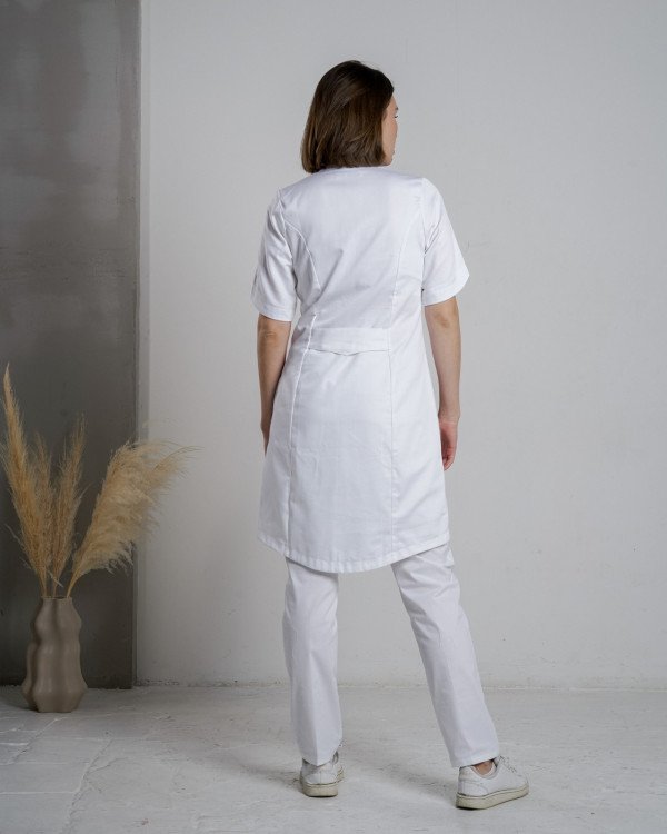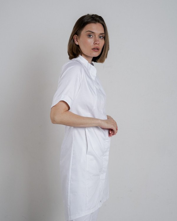 Приталенный женский халат с коротким рукавом. Застежка кнопки. Воротник стойка. Потайные карманы в боковых швах.