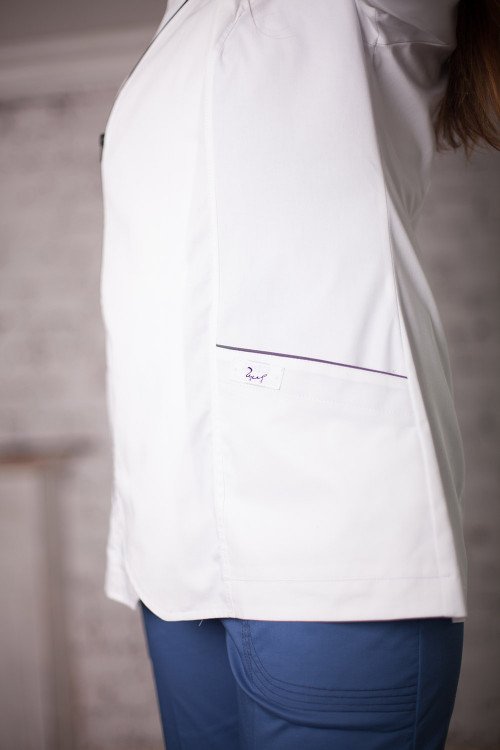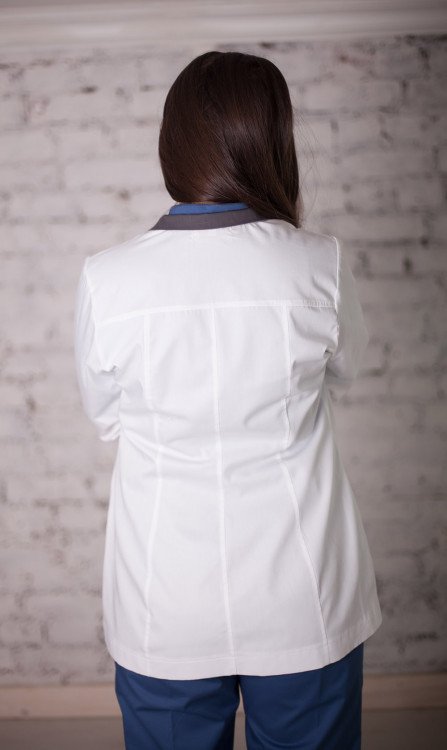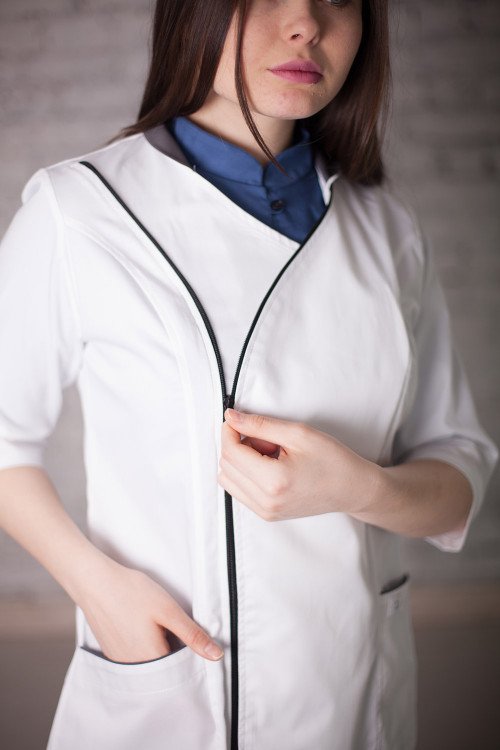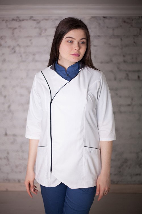 Укороченный халат на ассиметричной застежке молнии. Воротник-стойка с внутренним воротником из отделочного материала. Фигурные накладные карманы с кантом из отделочного материала. Рукава 2/3 длины. Ткань средней плотности.