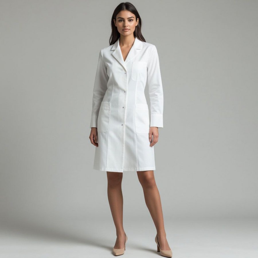 Женский медицинский халат белого цвета выполнен в полуприлегающем крое с металлическими застёжками-кнопками. Доступен в размерах от 44 до 56. Модель имеет классический V-образный вырез. На передней части халата расположены рельефные швы. Есть нагрудный карман и два кармана внизу. Сзади халат можно зафиксировать с помощью полупояса, застёгивающегося на кнопки. Этот халат отлично подходит для медицинских работников, студентов, сотрудников массажных салонов, мастеров маникюра и косметологов.