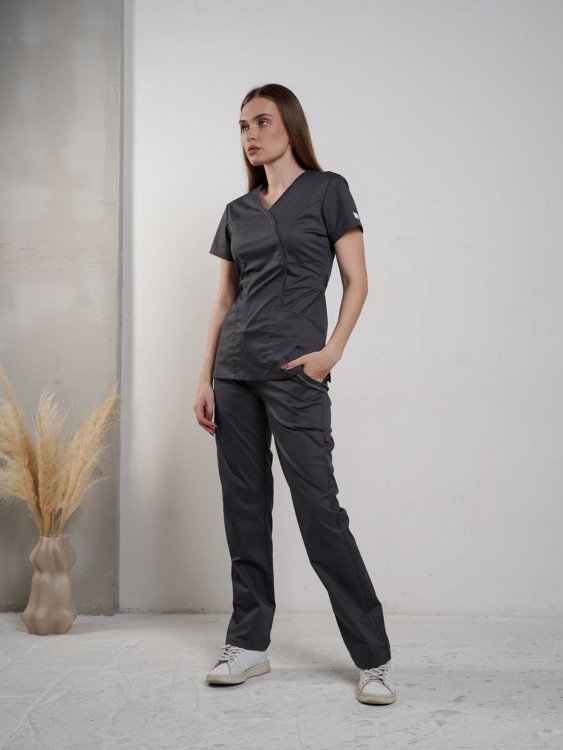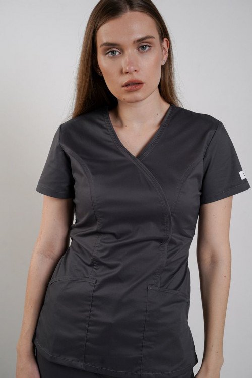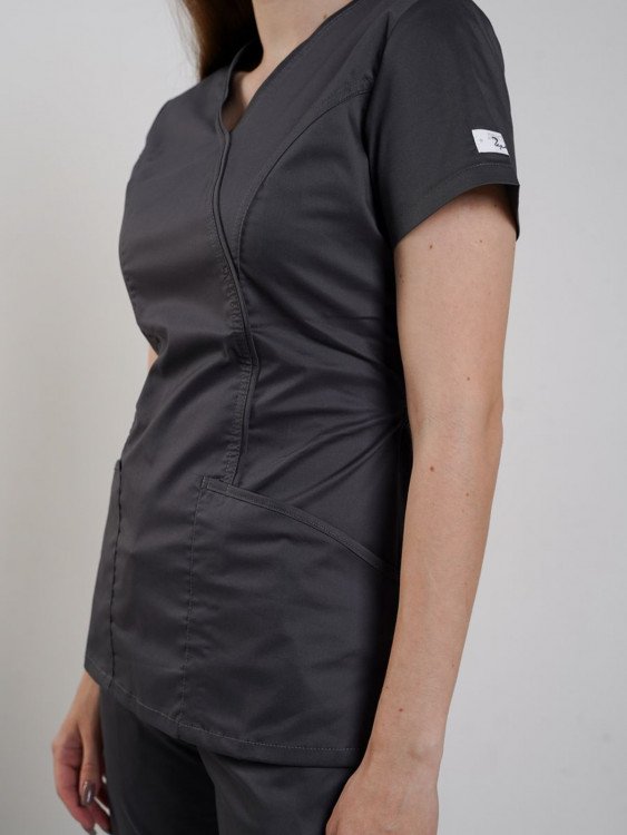 Топ женского медицинского костюма с короткими рукавами и с разрезами в низу боковых швов. Перед с имитацией запахнутого кимоно и с накладными боковыми карманами. Спинка регулируется эластичной тесьмой. Ткань с добавлением эластана.