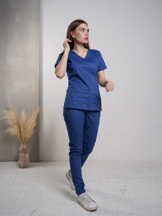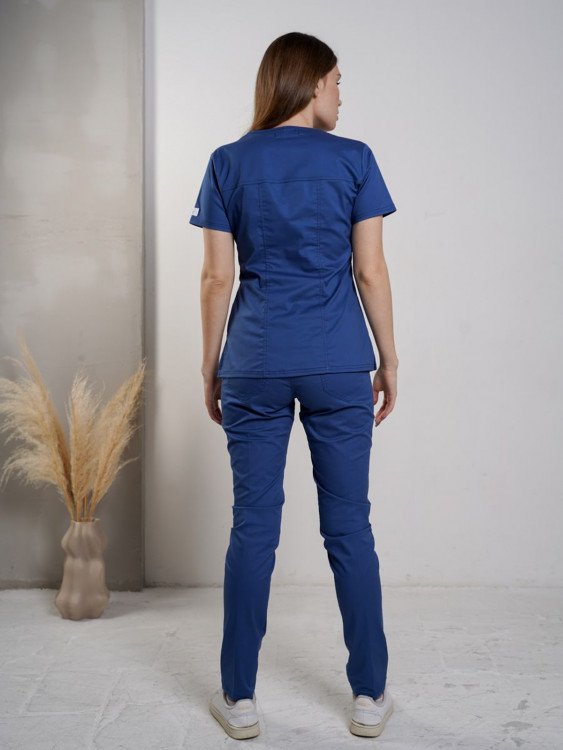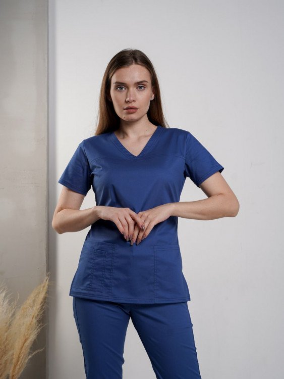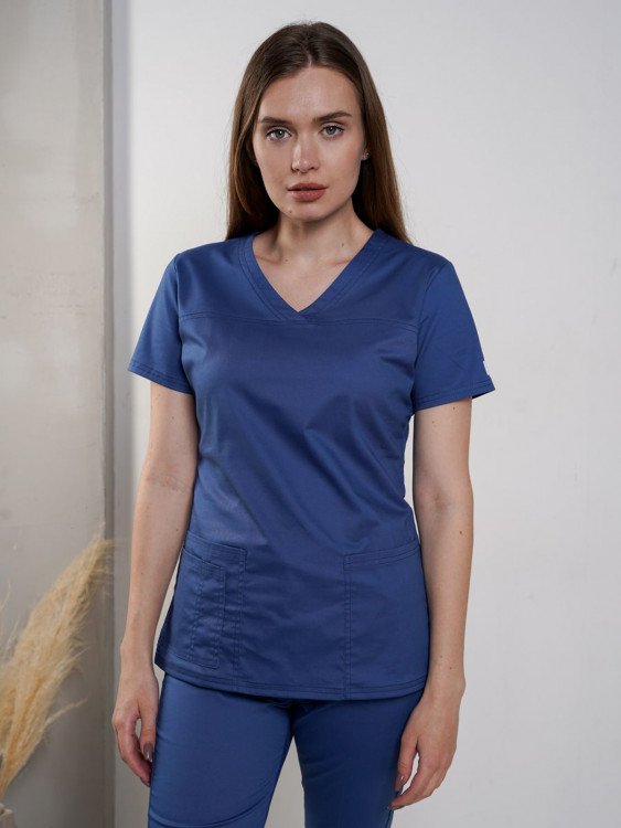 Топ женского хирургического костюма с короткими рукавами и с разрезами внизу боковых швов. Перед с V-образным воротом, с кокетками и накладными боковыми карманами. Спинка с рельефными швами и кокеткой. Ткань с добавлением эластана.