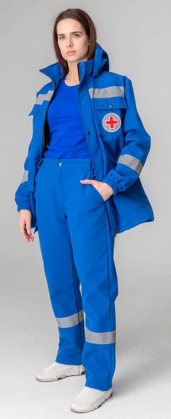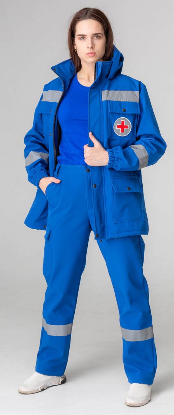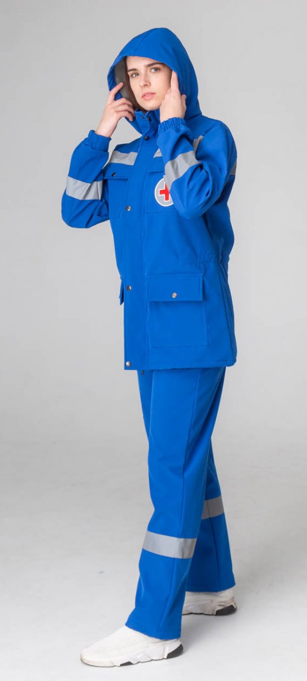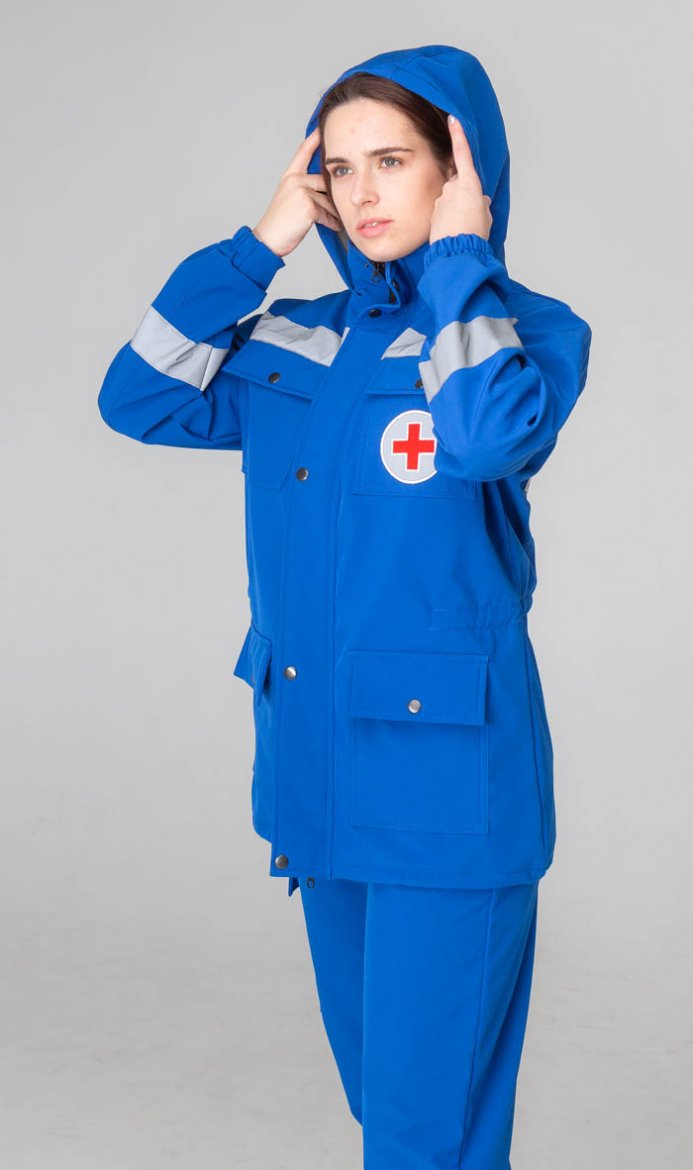 Куртка прямого силуэта с капюшоном и воротником стойкой, застежка на двухзамковую молнию с защитной планкой. На полочках по кокеткам проложена светоотражающая лента 5 см и накладные карманы с клапаном (2 нагрудных и 2 нижних боковых). На нагрудном левом кармане шеврон в серебристом круге красный крест.