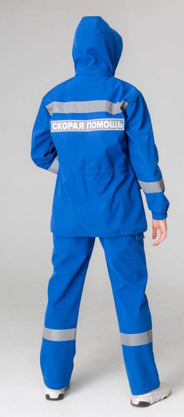 Спинка цельнокроеная, светоотражающая лента шириной 5 см, ниже расположен шеврон «Скорая помощь». По линии талии проложена кулиска. Рукав втачной, длинный, манжета на резинке.
