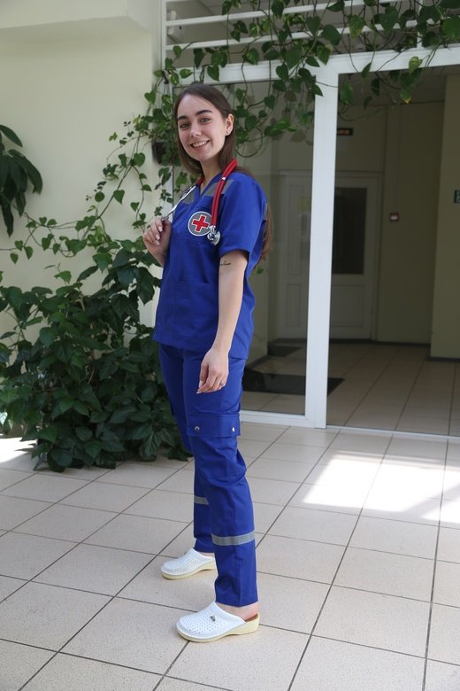 На левом верхнем кармане расположен круглый шеврон из светоотражающей ткани, с нанесением вышивки красный крест.