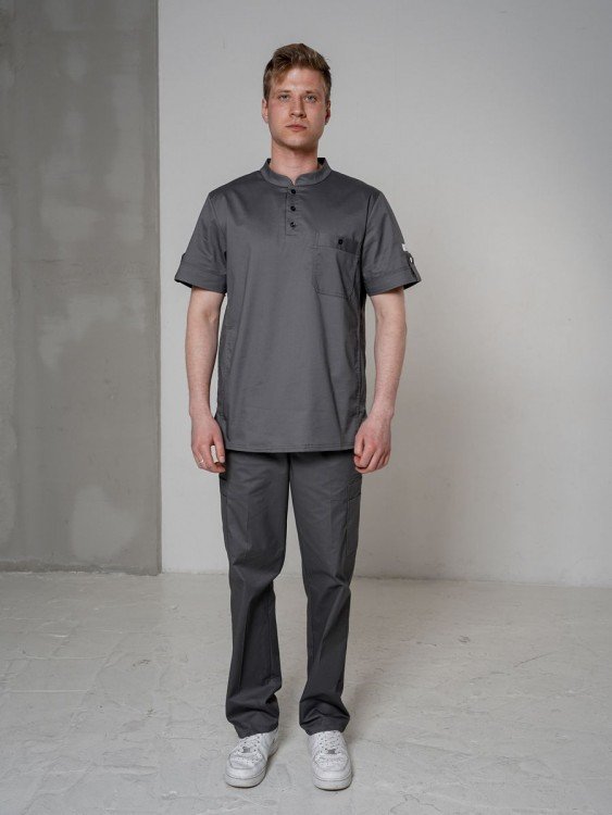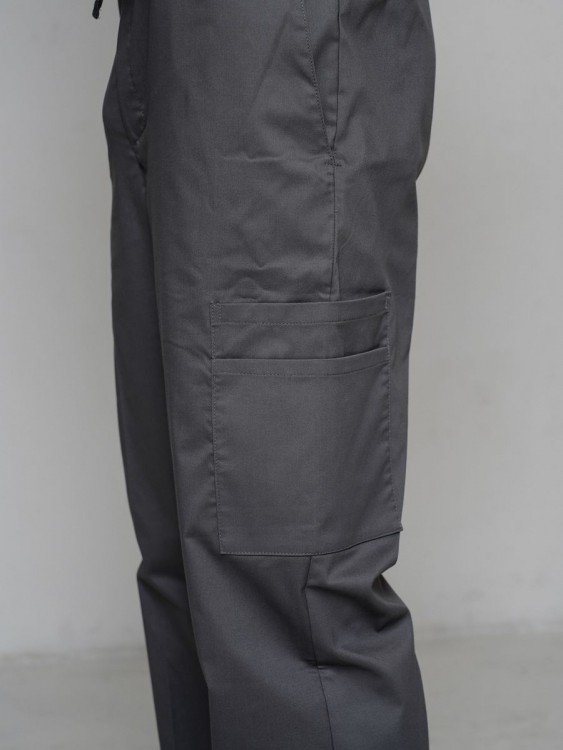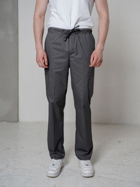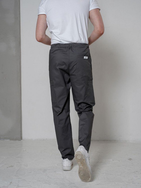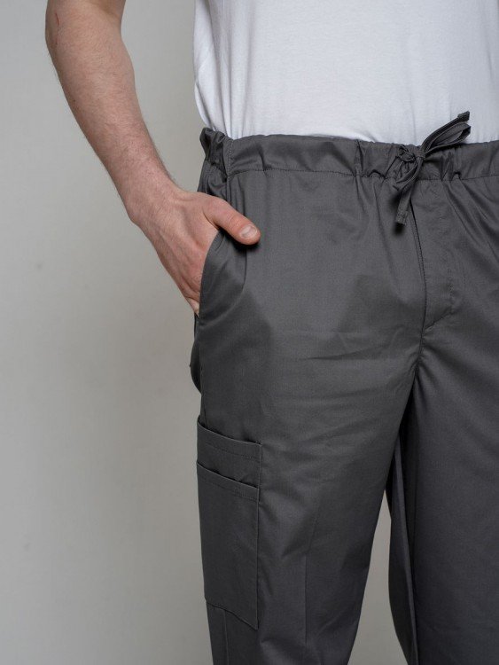 Брюки медицинские мужские, на поясе с эластичной тесьмой и шнуром. Перед с потайной застежкой на тесьму-молнию, с боковыми отрезными карманами. На правой задней половинке брюк накладной фигурный карман на липучке. На боковых швах изделия накладные карманы.