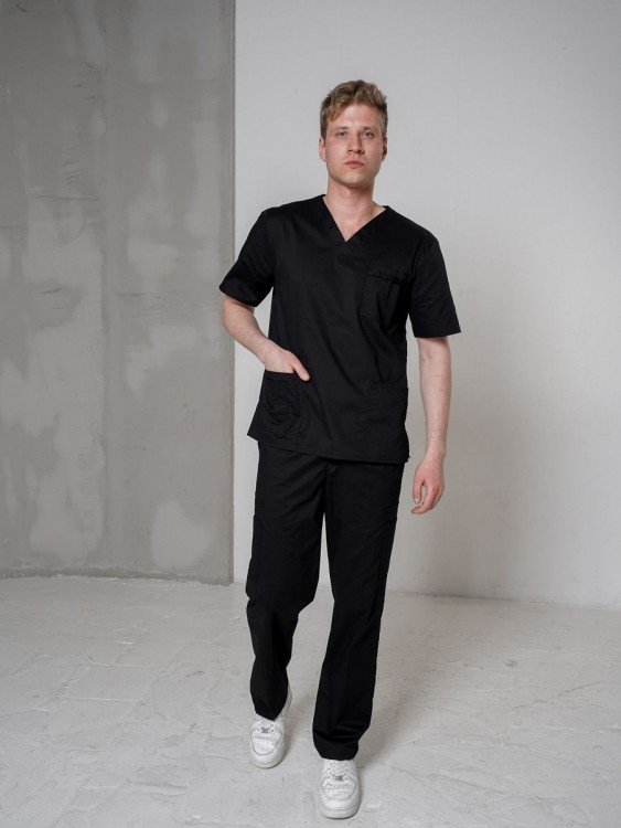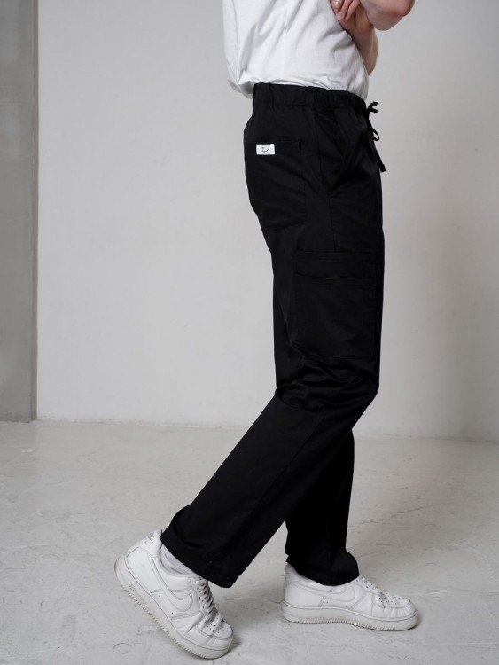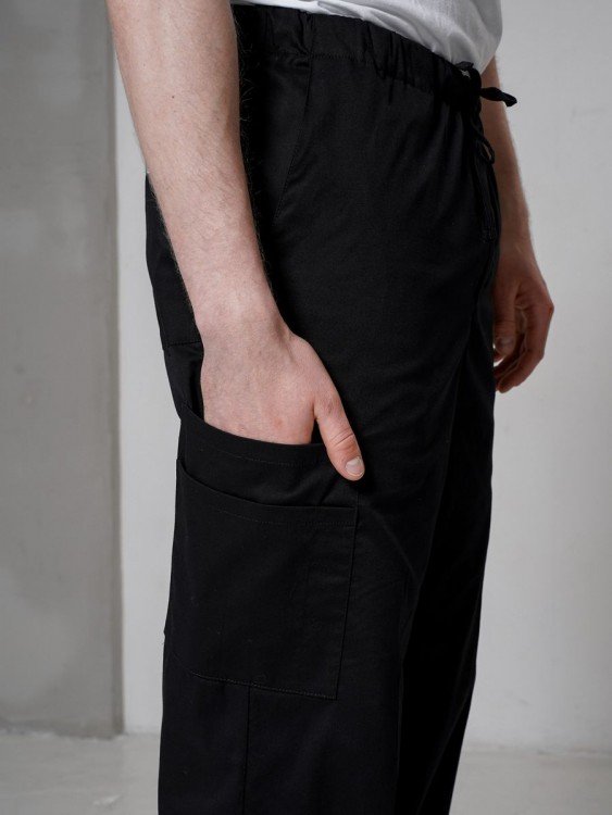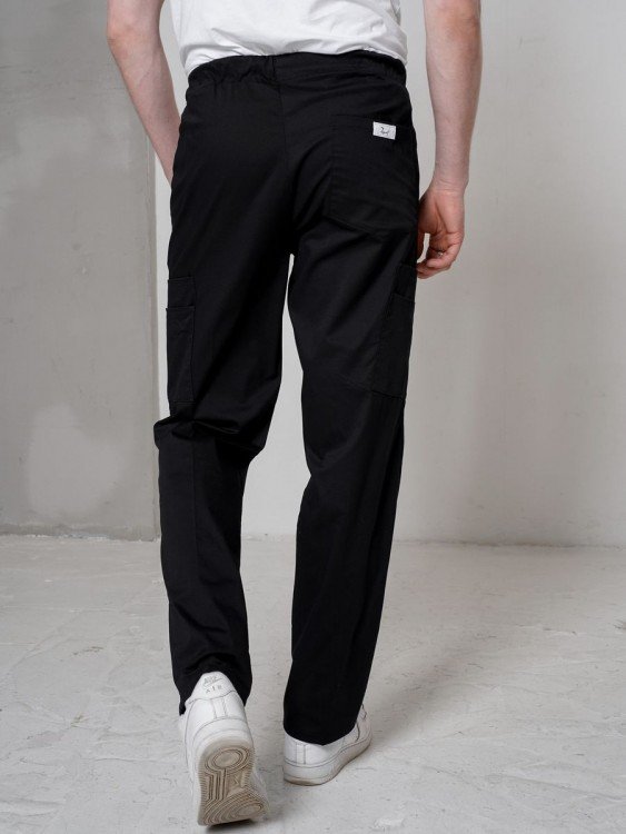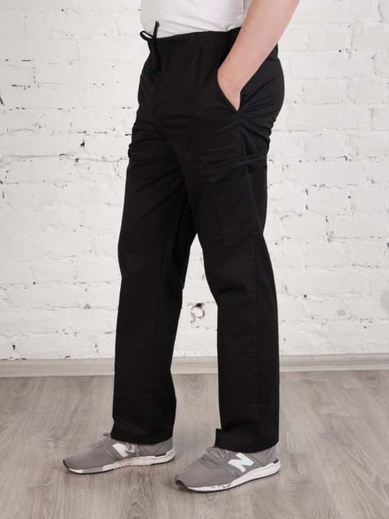 Брюки медицинские мужские, на поясе с эластичной тесьмой и шнуром. Перед с потайной застежкой на тесьму-молнию, с боковыми отрезными карманами. На правой задней половинке брюк накладной фигурный карман на липучке. На боковых швах изделия накладные карманы.
