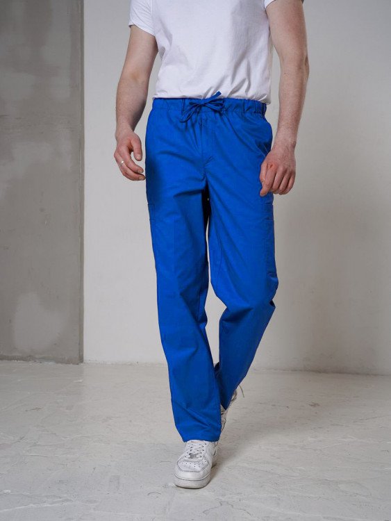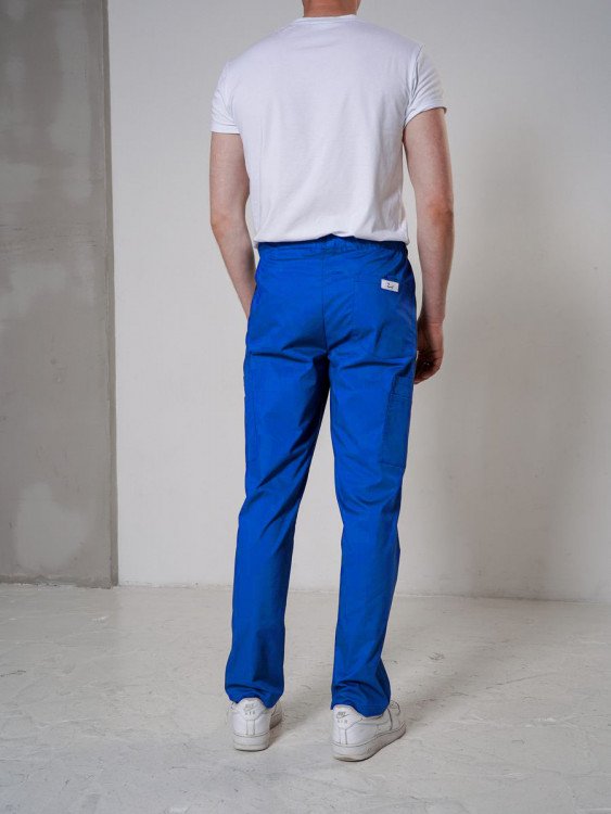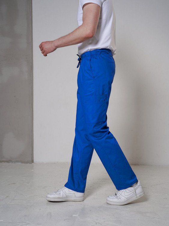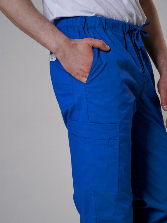 Брюки медицинские мужские, на поясе с эластичной тесьмой и шнуром. Перед с потайной застежкой на тесьму-молнию, с боковыми отрезными карманами. На правой задней половинке брюк накладной фигурный карман на липучке. На боковых швах изделия накладные карманы.