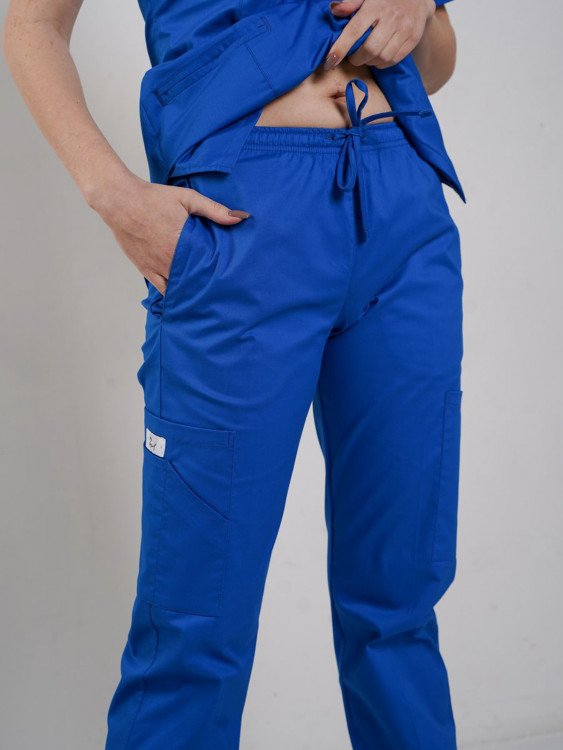 Брюки медицинские средней посадки, на поясе с эластичной тесьмой. Перед с боковыми отрезными карманами. На боковых швах накладные карманы.