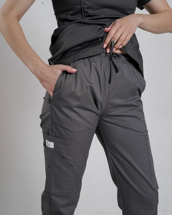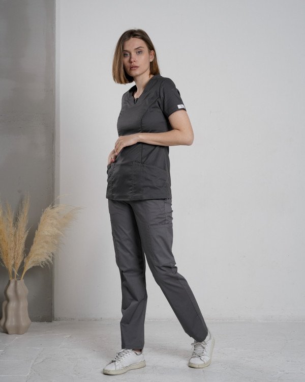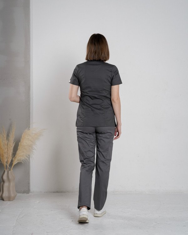 Брюки медицинские средней посадки, на поясе с эластичной тесьмой. Перед с боковыми отрезными карманами. На боковых швах накладные карманы.