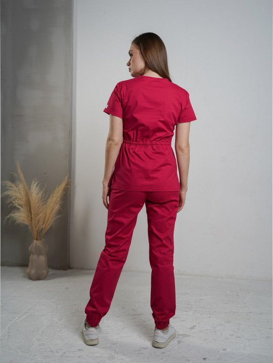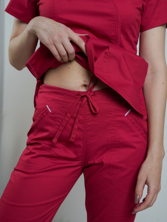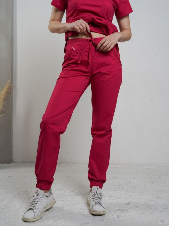 Брюки медицинские женские с высокой посадкой, на поясе с эластичной тесьмой по спинке и шнуром спереди. На передних и задних половинках брюк прорезные карманы "в рамку", с закрепками на концах отделочными нитками. На передних половинках брюк карманы застегиваются на навесную петлю и пуговицу. На лодышках эластичные резинки - "джаггеры"