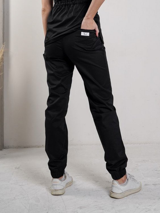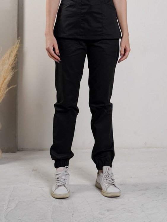 Брюки медицинские женские с высокой посадкой, на поясе с эластичной тесьмой по спинке и шнуром спереди. На передних и задних половинках брюк прорезные карманы "в рамку", с закрепками на концах отделочными нитками. На передних половинках брюк карманы застегиваются на навесную петлю и пуговицу. На лодышках эластичные резинки - "джаггеры"