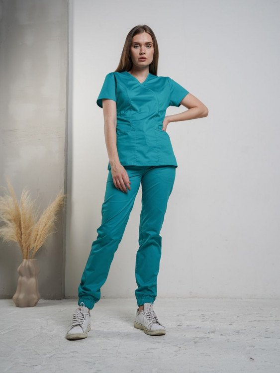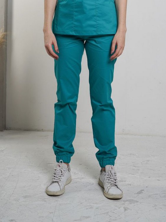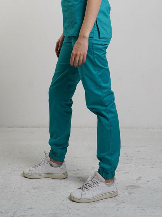 Брюки медицинские женские с высокой посадкой, на поясе с эластичной тесьмой по спинке и шнуром спереди. На передних и задних половинках брюк прорезные карманы "в рамку", с закрепками на концах отделочными нитками. На передних половинках брюк карманы застегиваются на навесную петлю и пуговицу. На лодышках эластичные резинки - "джаггеры"