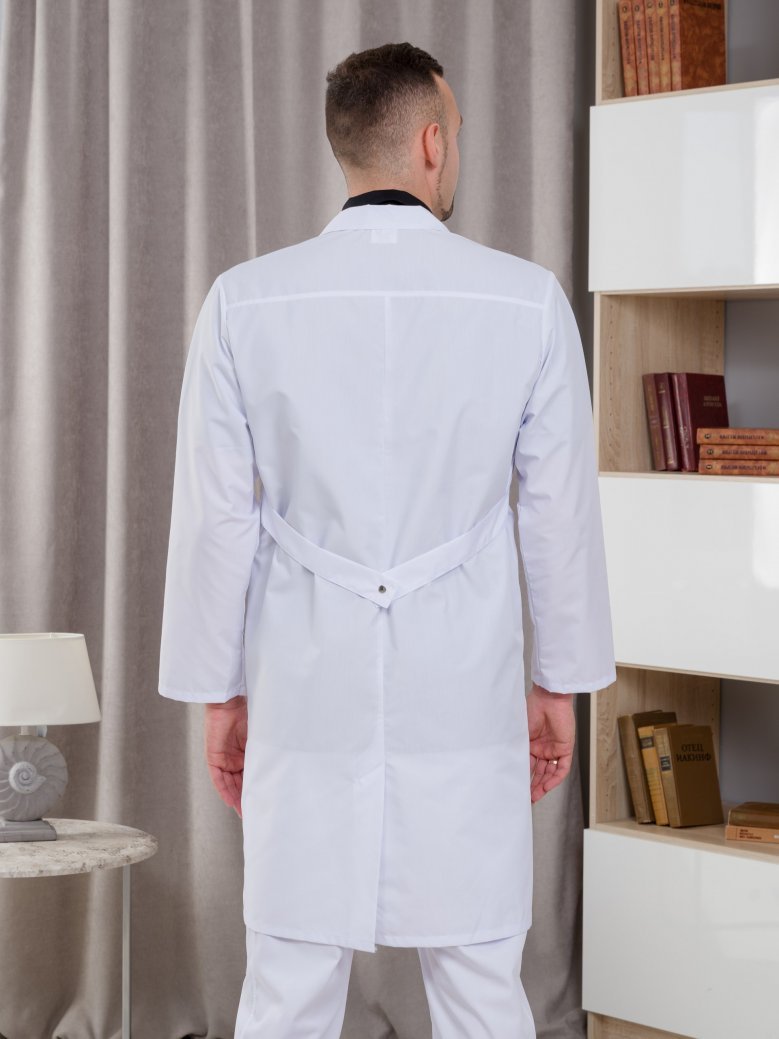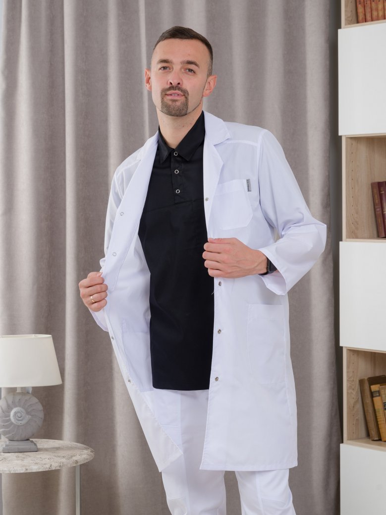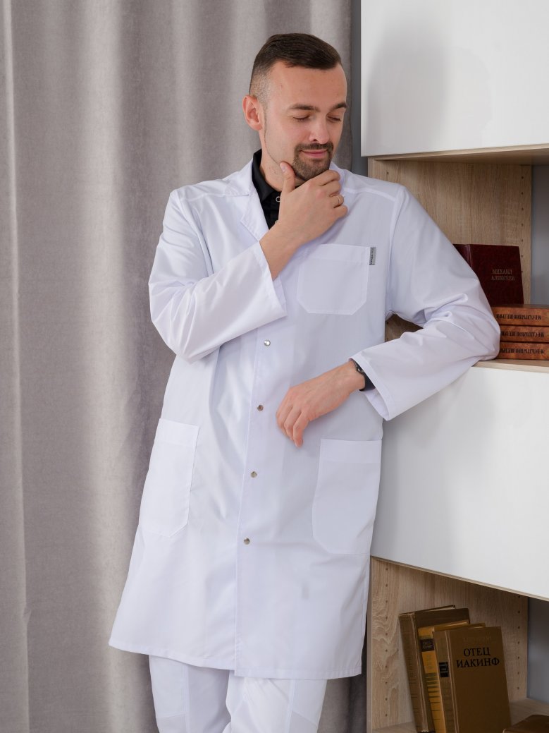 Халат медицинский имеет большой размерный ряд , есть большие размеры (от 40/42 до 64/66). Униформа изготовлена в белом цвете. Обратите внимание на этот мужской медицинский халат на клепках с длинным рукавом, английским воротником и тремя накладными карманами: 1 находится на груди, 2 других - снизу по бокам. Такой материал легкий в уходе и износостойкий.