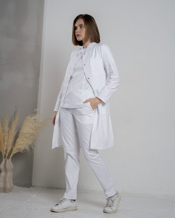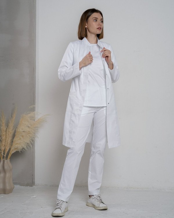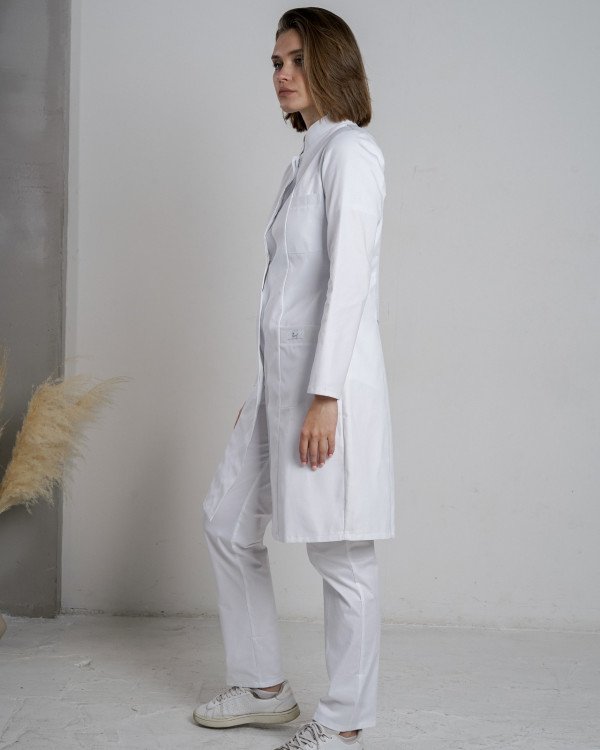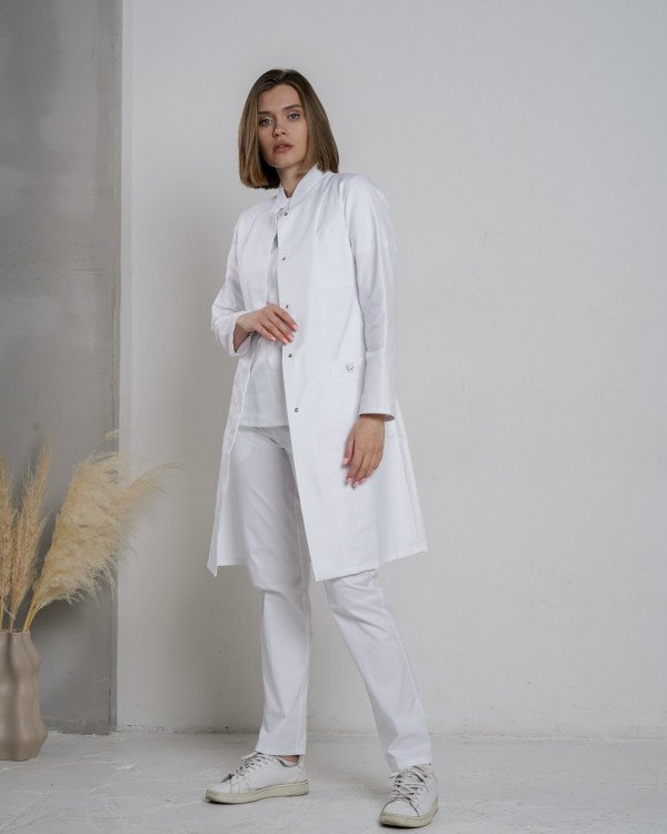 Халат медицинский женский классический, с воротником-стойкой. Перед с центральной потайной застежкой на кнопки, с рельефными швами, с накладными боковыми и нагрудным карманами. Спинка с рельефными швами и поясом. Рукава без манжеты до запястья.Длина рукава - полная. Ткань из Японии.