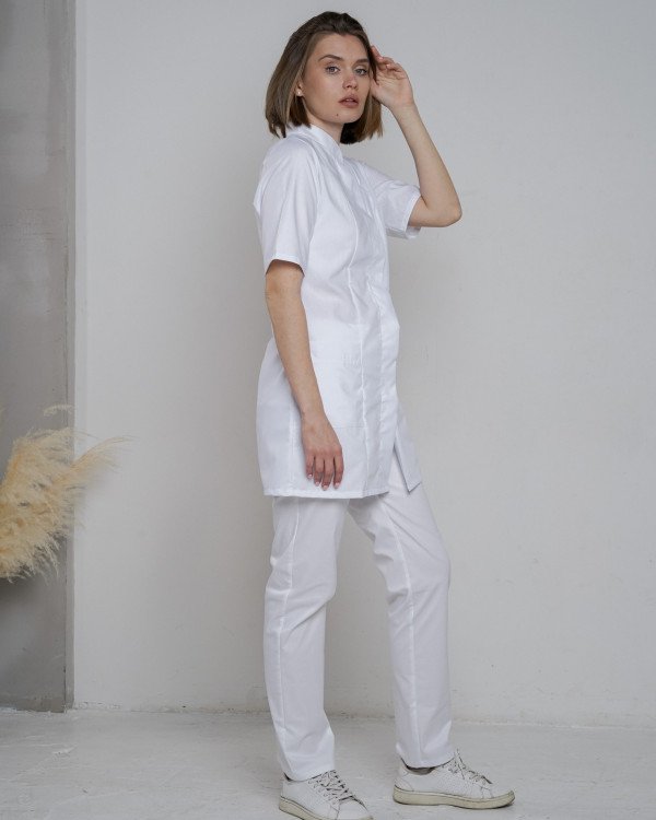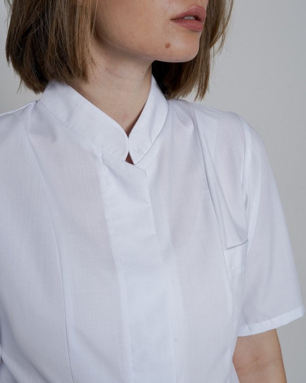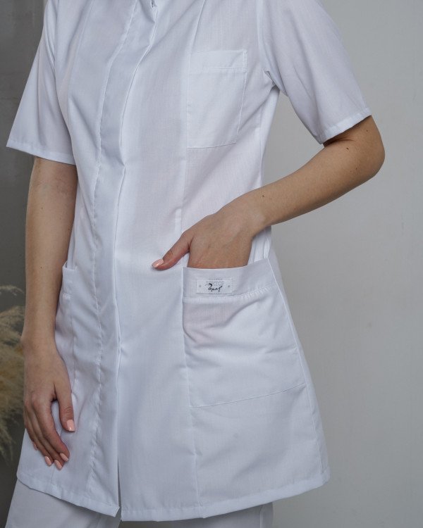 Халат медицинский женский классический, с воротником-стойкой. Перед с центральной потайной застежкой на кнопки, с рельефными швами, с накладными боковыми и нагрудным карманами. Спинка с рельефными швами и поясом. Длина рукава - 1/2. Укороченная длина.