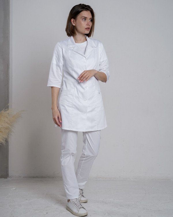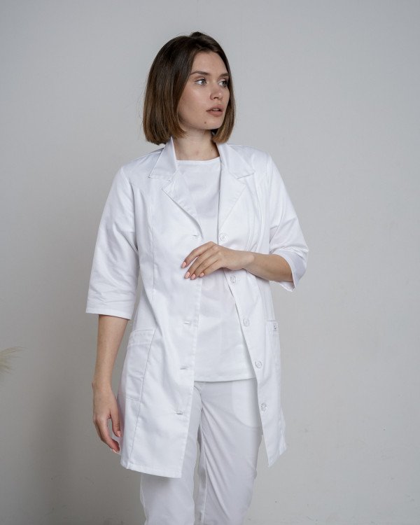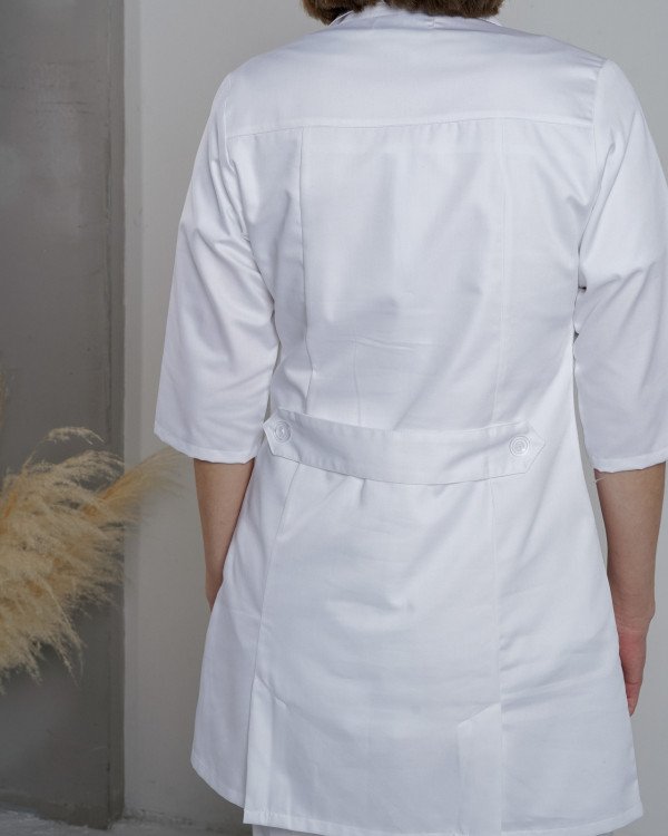 Халат медицинский женский молодежный укороченный, с английским воротом. Перед с центральной застежкой на петли и пуговицы, с рельефными швами и накладными боковыми карманами со скошенным входом в карман. Спинка с кокеткой, с рельефными швами со шлицами, с хлястиком на пуговицах. Рукава 2/3 длины.Ткань из Японии