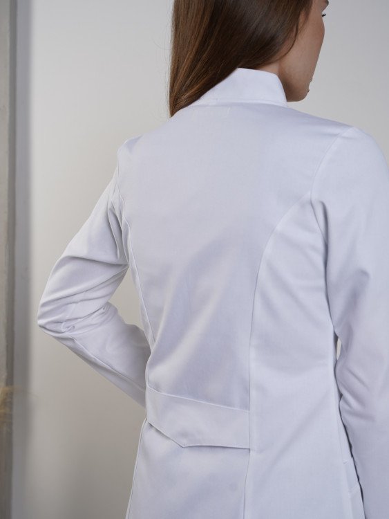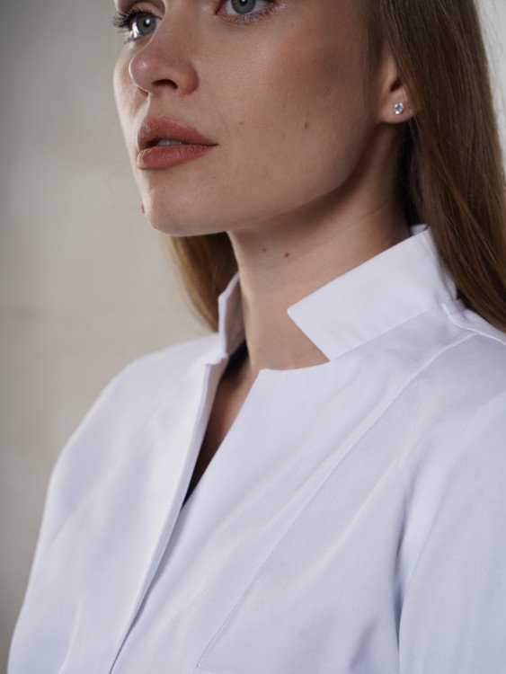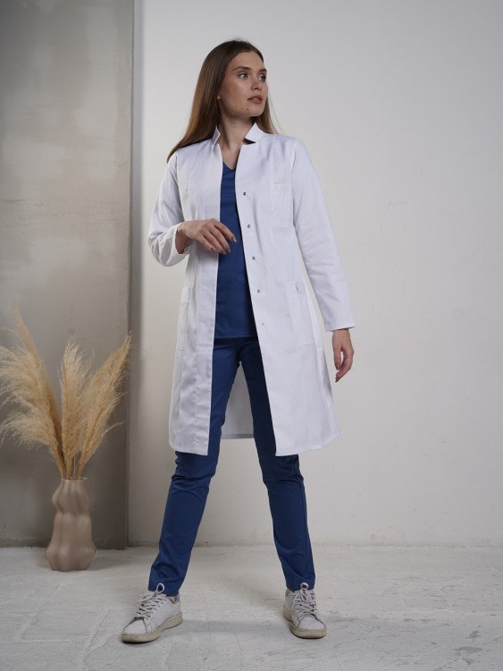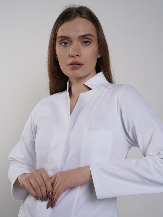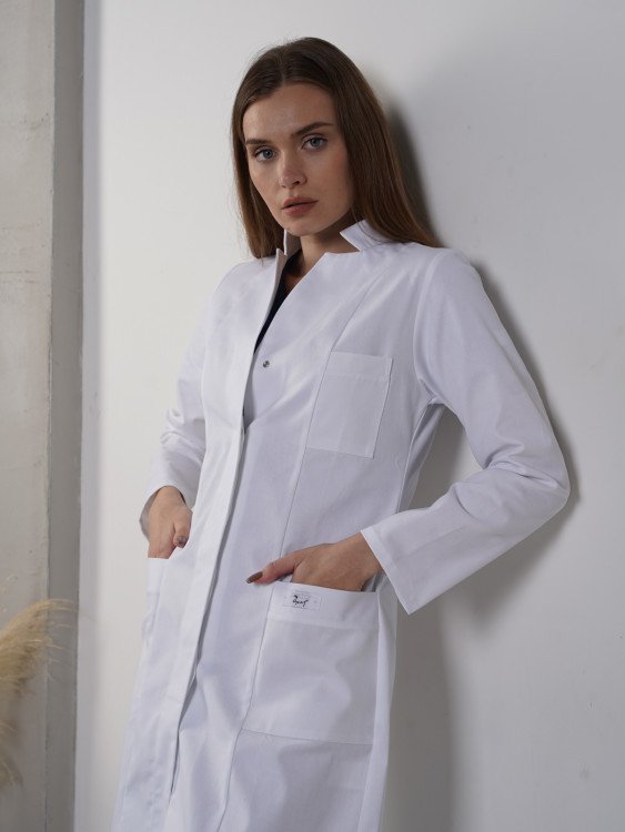 Халат медицинский женский классический, с воротником-стойкой. Перед с центральной потайной застежкой на кнопки, с рельефными швами, с накладными боковыми и нагрудным карманами. Спинка с рельефными швами и поясом. Рукава без манжеты до запястья.Длина рукава - полная. Ткань из Японии.