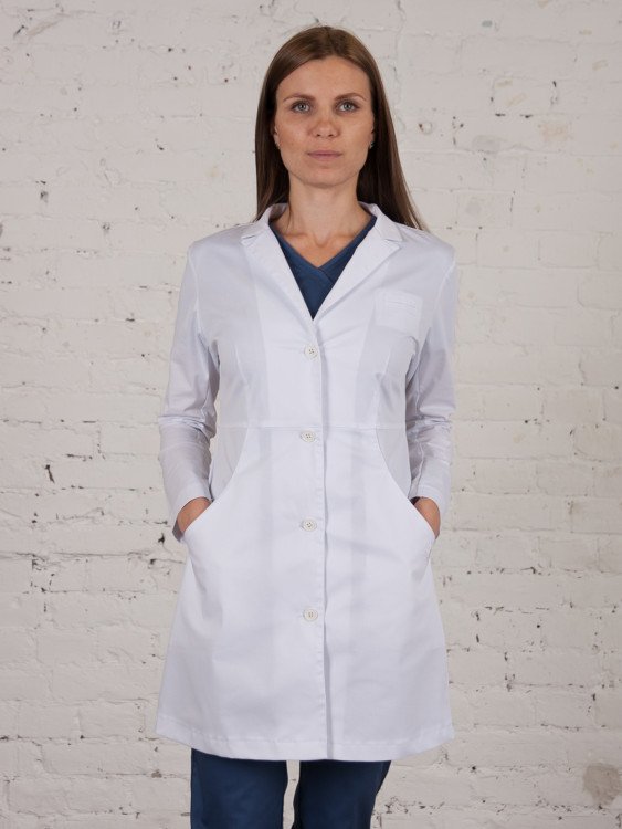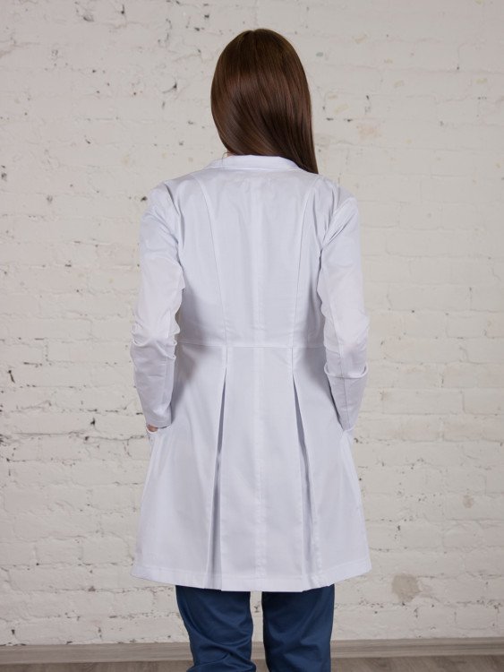 Халат средней длины с отложным воротником. Застежка на 4 пуговицы. Косые прорезные карманы. Сзади две вертикальные фолды. Ткань со спандексом.