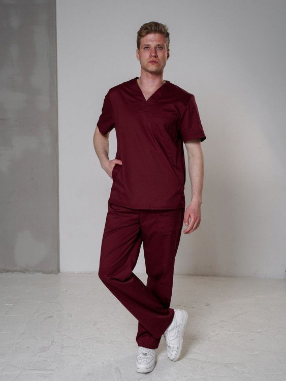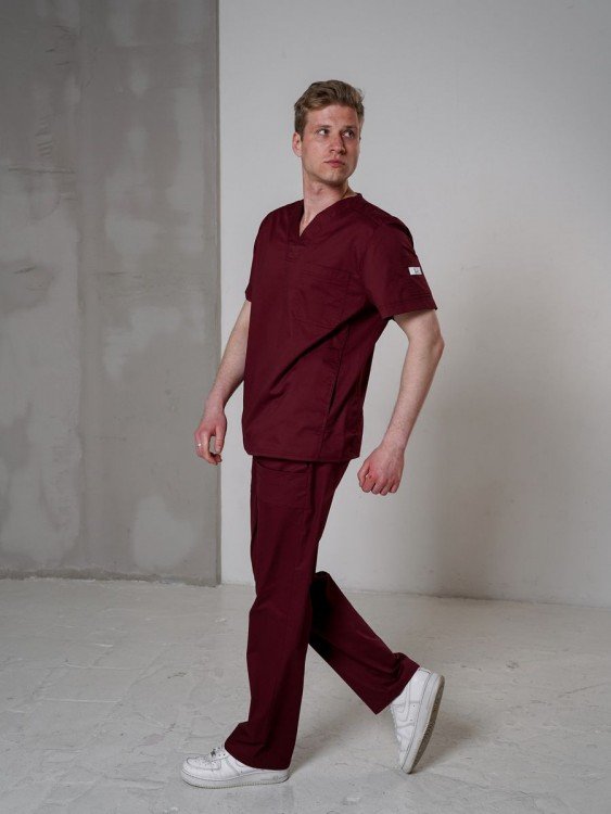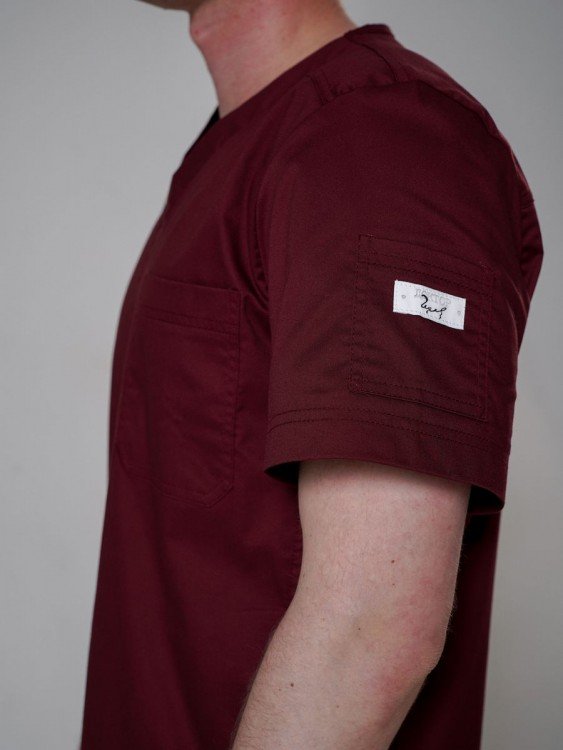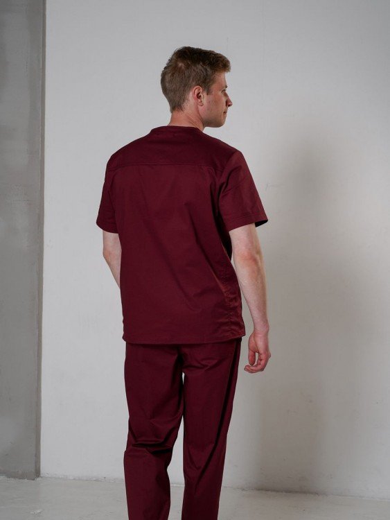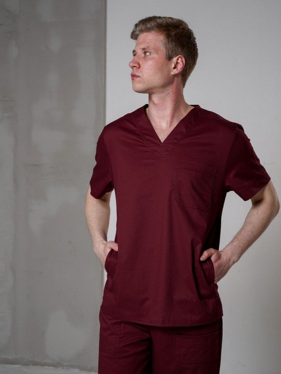 Топ медицинского костюма мужской с короткими рукавами, на левом рукаве накладной карман. Перед c V-образным воротом, с кокетками, с нагрудным карманом и с боковыми карманами в рельефных швах. Спинка с кокеткой и рельефными швами. Ткань с добавлением спандекса.