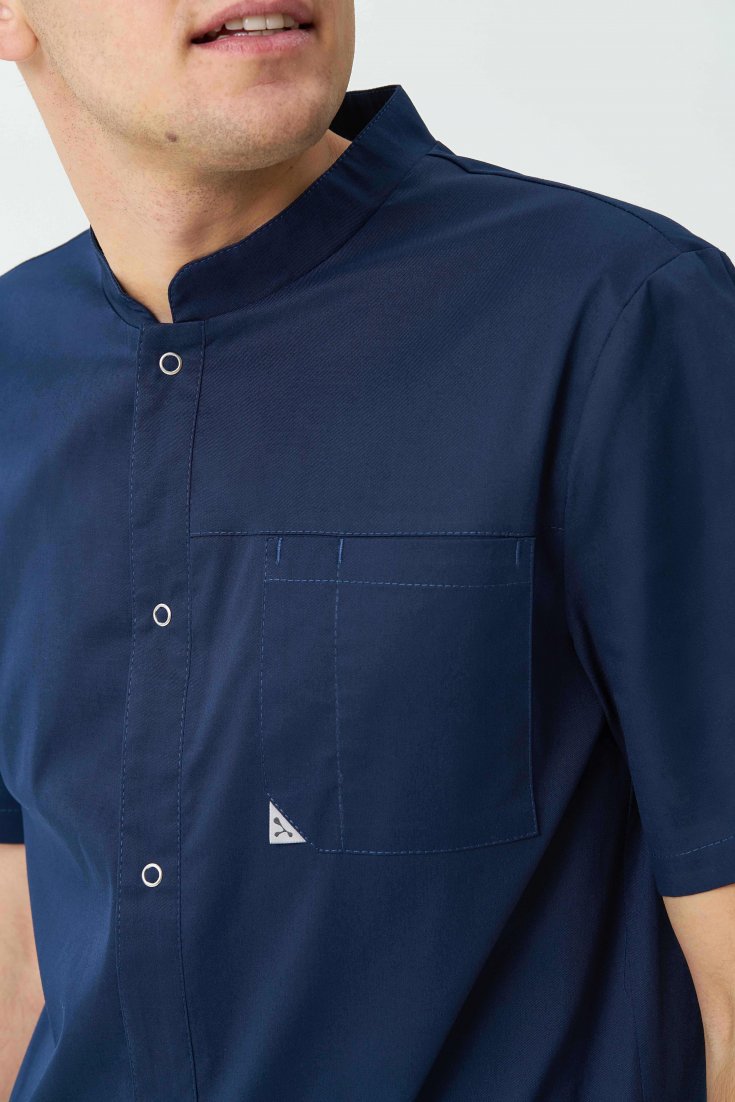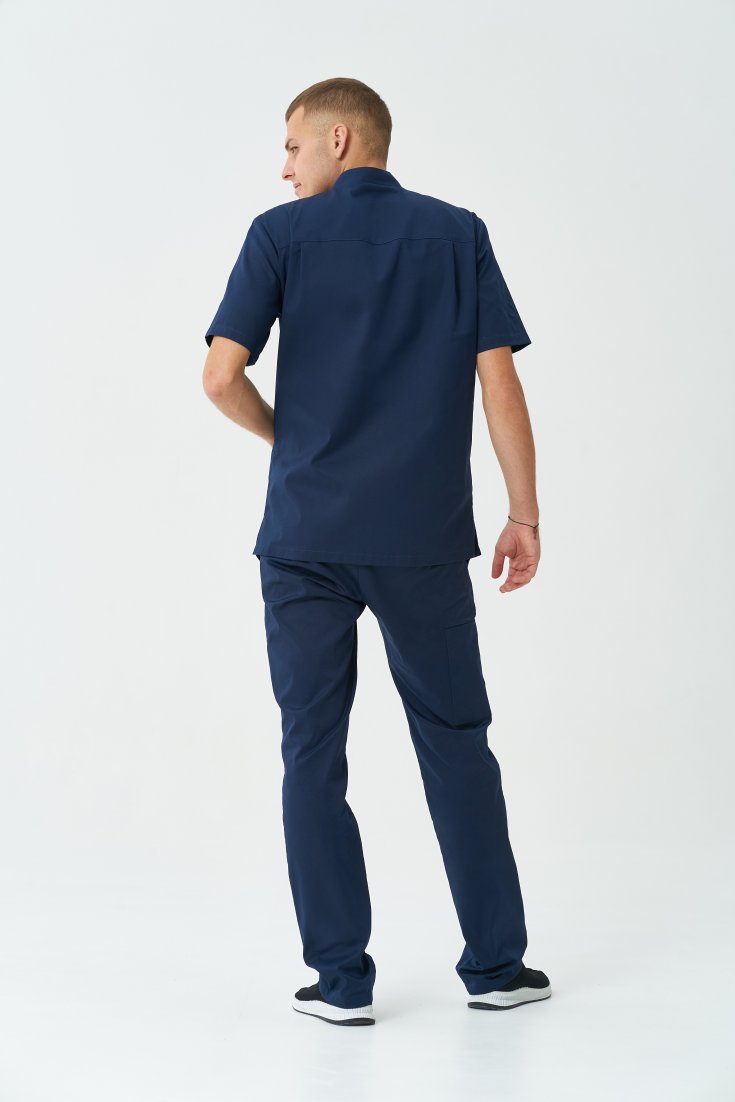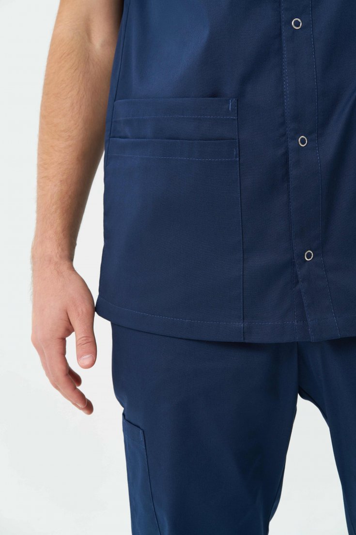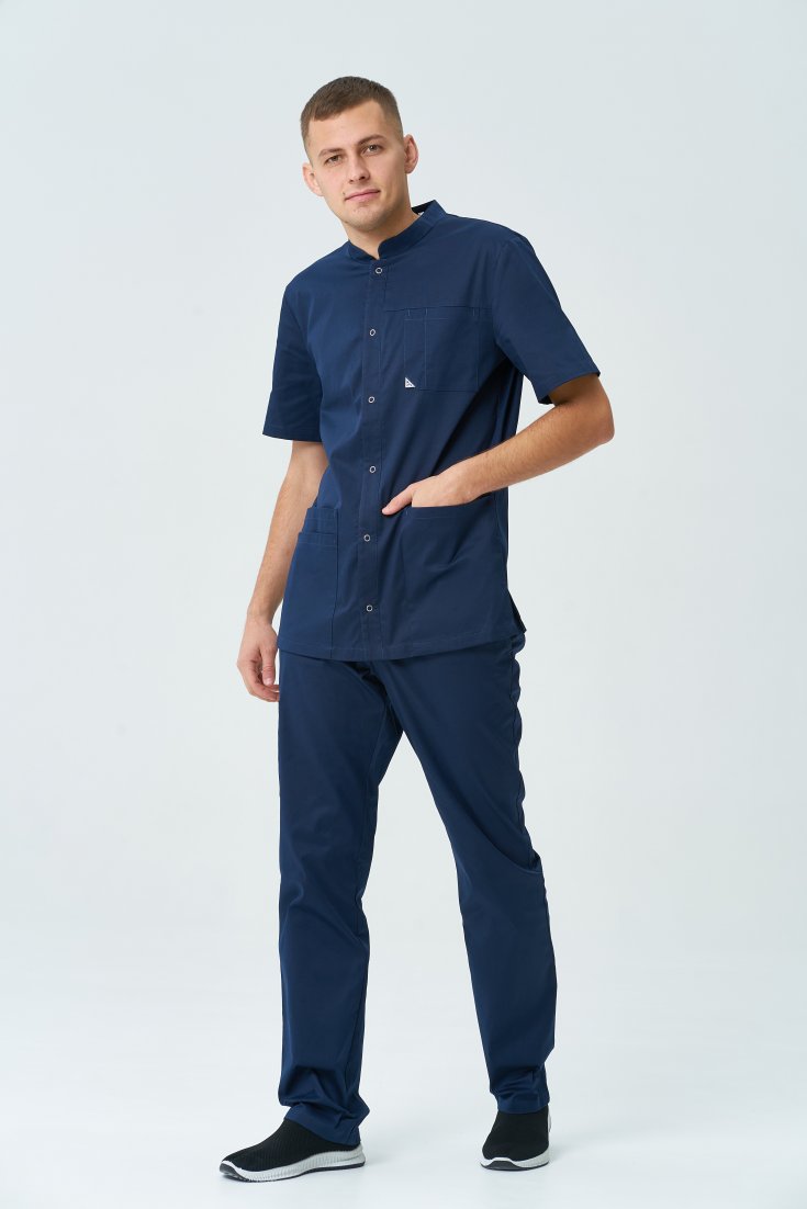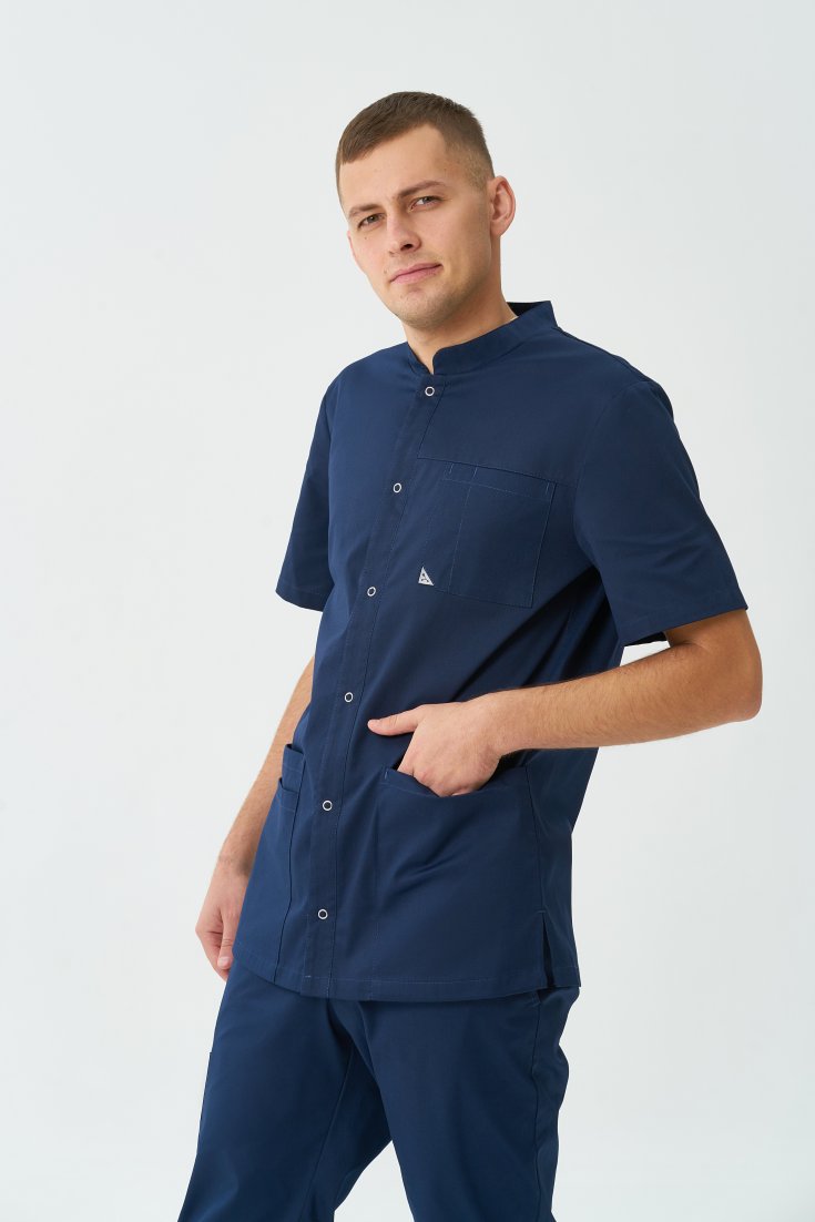 Блуза мужская прямого силуэта с центральной бортовой застежкой на металлические кнопки, с разрезами в боковых швах. Левая полочка с отрезной кокеткой и планкой , боковым нижним карманом. На левой полочке расположен нагрудный карман фигурной формы. Правая полочка с отрезной планкой, и двойным боковым нижним карманом. Спинка с отрезной кокеткой, и складками для свободы движения. Воротник втачной- стойка. Рукава втачные , одношовные, короткие.