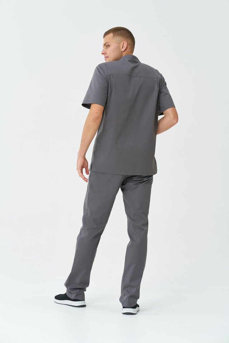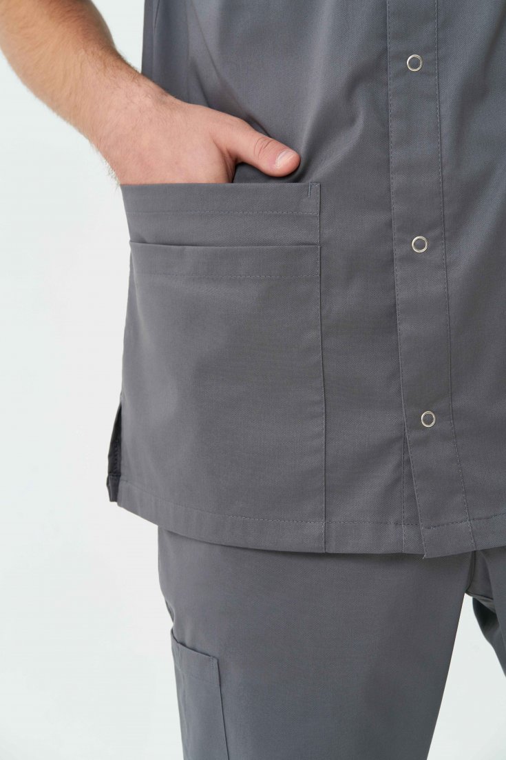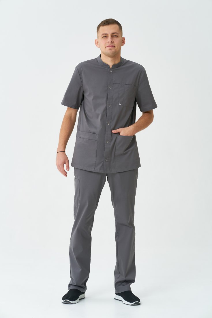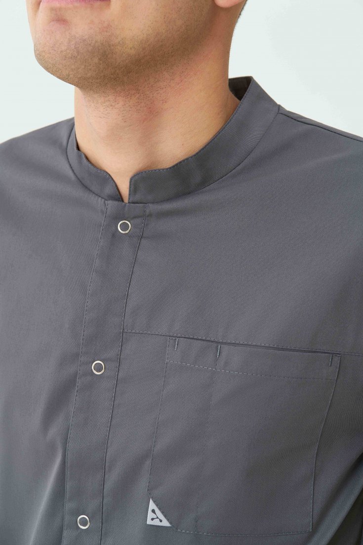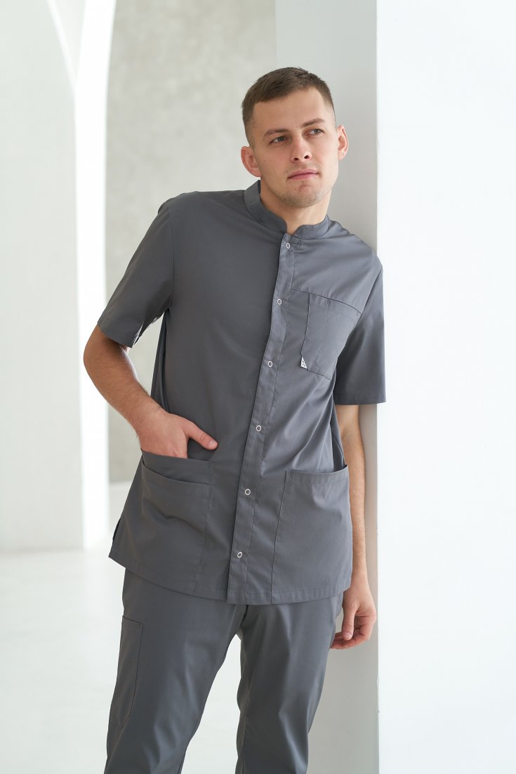 Блуза мужская прямого силуэта с центральной бортовой застежкой на металлические кнопки, с разрезами в боковых швах. Левая полочка с отрезной кокеткой и планкой , боковым нижним карманом. На левой полочке расположен нагрудный карман фигурной формы. Правая полочка с отрезной планкой, и двойным боковым нижним карманом. Спинка с отрезной кокеткой, и складками для свободы движения. Воротник втачной- стойка. Рукава втачные , одношовные, короткие.