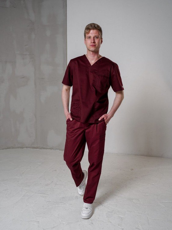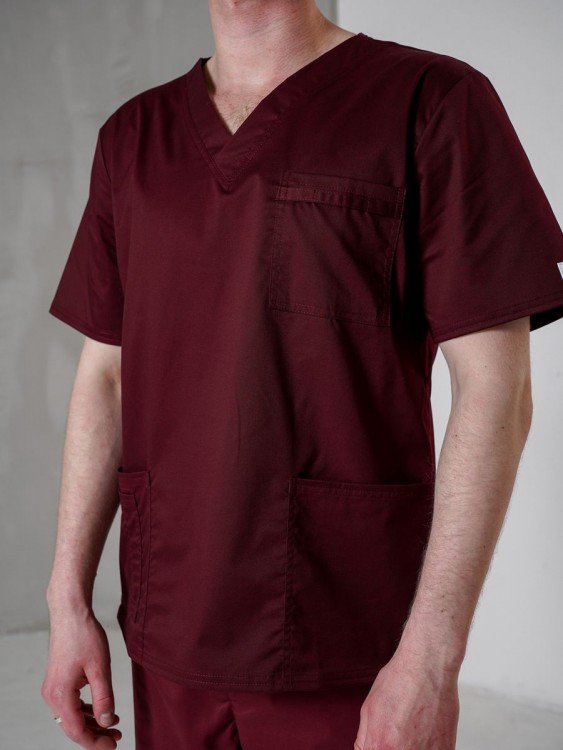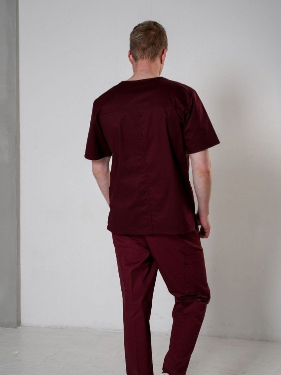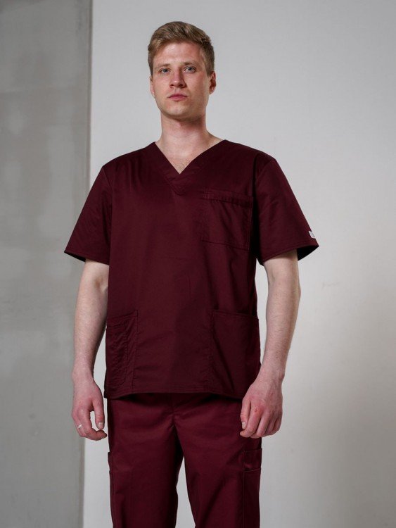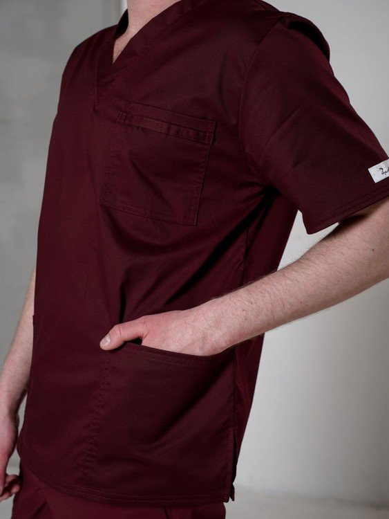 Топ мужского хирургического костюма с короткими рукавами и с разрезами в низу боковых швов. Перед с V-образным воротом, с накладными боковыми и нагрудным карманами. Спинка с кокеткой и средним швом. Ткань с добавлением эластана.