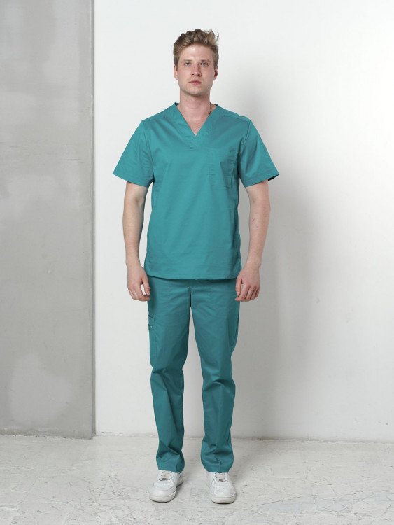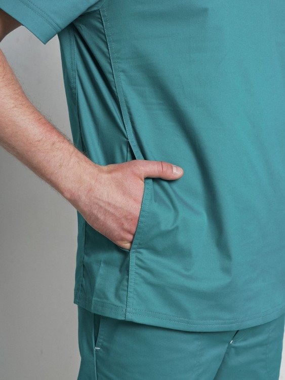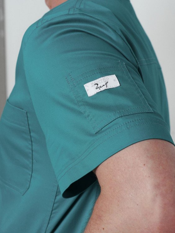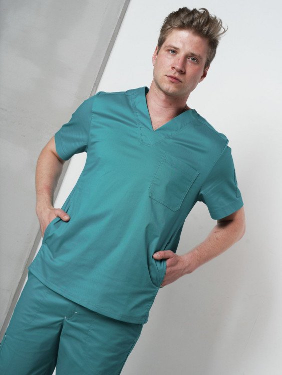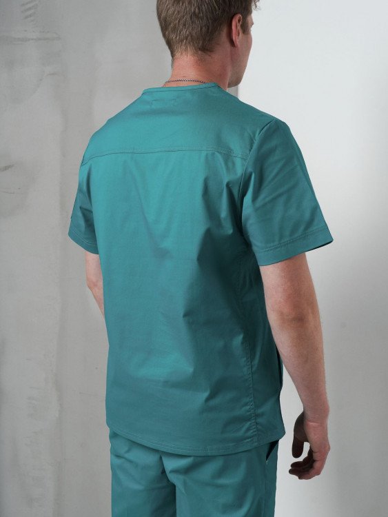 Топ медицинского костюма мужской с короткими рукавами, на левом рукаве накладной карман. Перед c V-образным воротом, с кокетками, с нагрудным карманом и с боковыми карманами в рельефных швах. Спинка с кокеткой и рельефными швами. Ткань с добавлением спандекса.