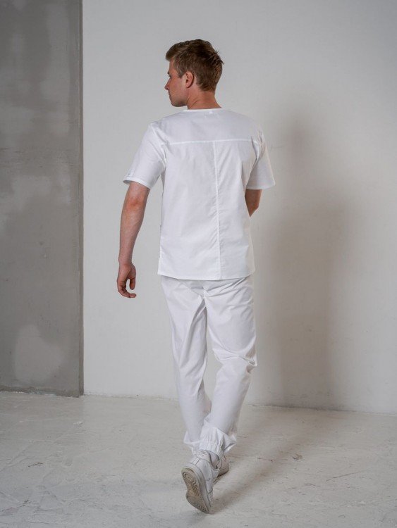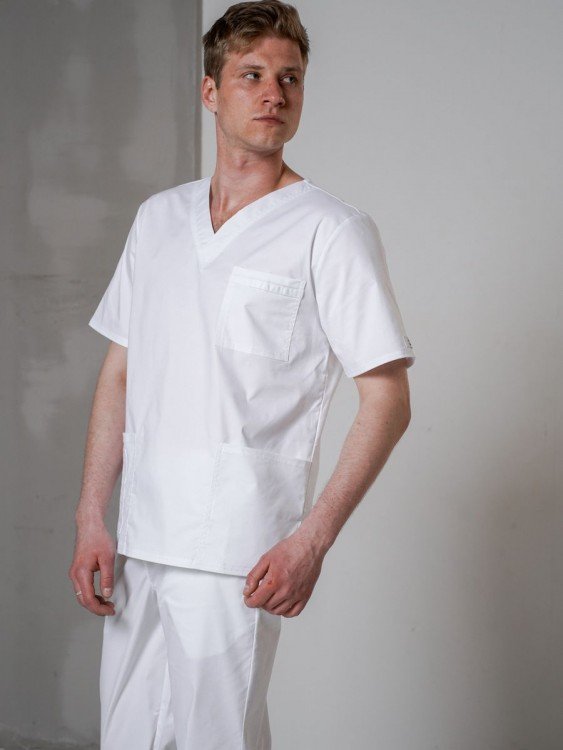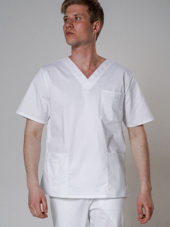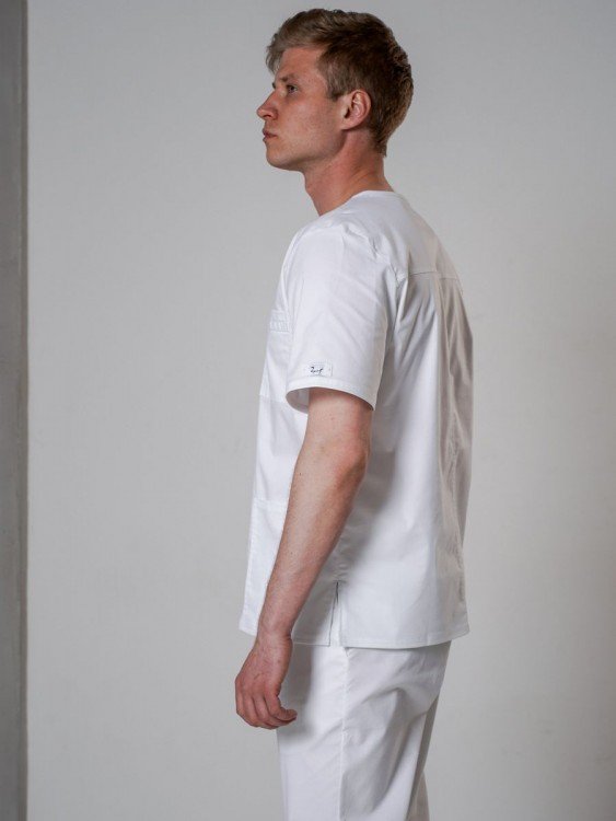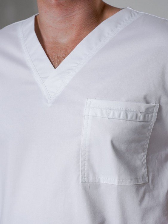 Топ мужского хирургического костюма с короткими рукавами и с разрезами в низу боковых швов. Перед с V-образным воротом, с накладными боковыми и нагрудным карманами. Спинка с кокеткой и средним швом. Ткань с добавлением эластана.