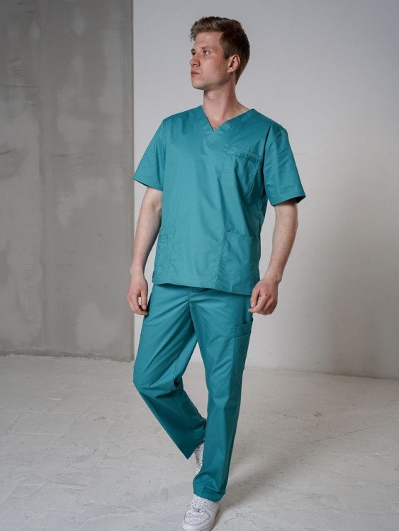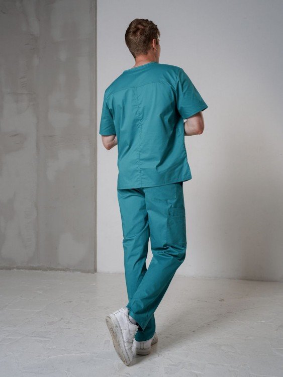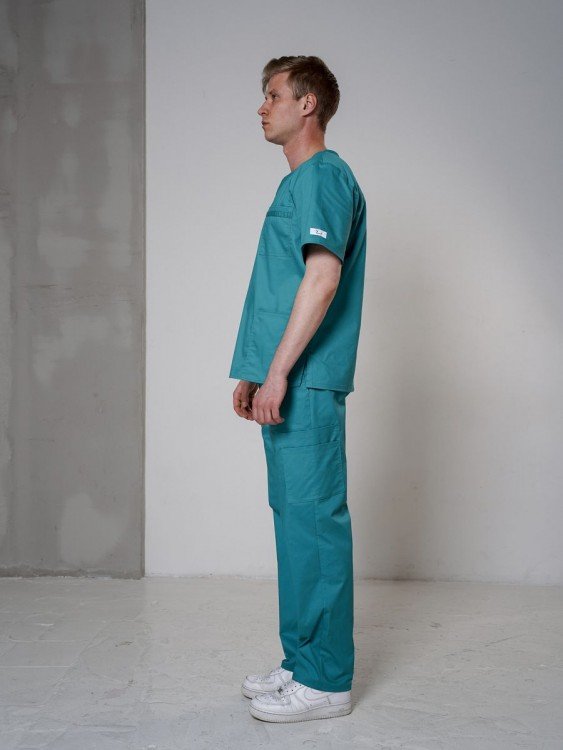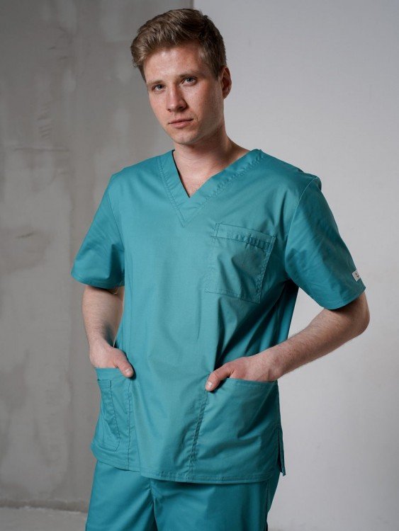 Топ мужского хирургического костюма с короткими рукавами и с разрезами в низу боковых швов. Перед с V-образным воротом, с накладными боковыми и нагрудным карманами. Спинка с кокеткой и средним швом. Ткань с добавлением эластана.