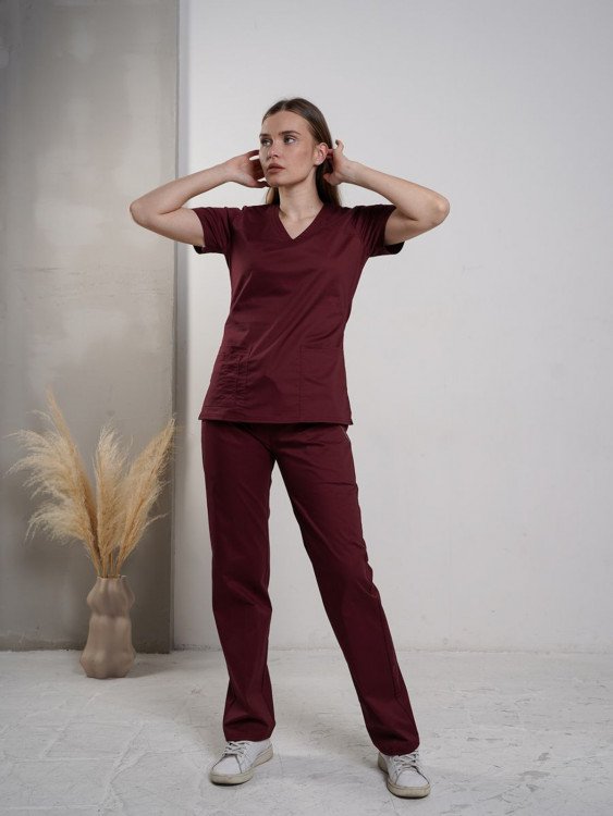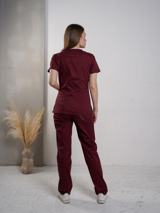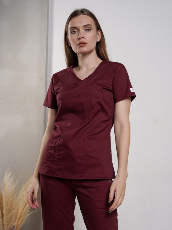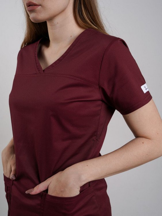 Топ женского хирургического костюма с короткими рукавами и с разрезами внизу боковых швов. Перед с V-образным воротом, с кокетками и накладными боковыми карманами. Спинка с рельефными швами и кокеткой. Ткань с добавлением эластана.