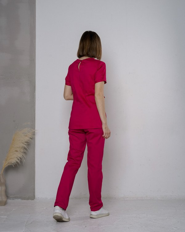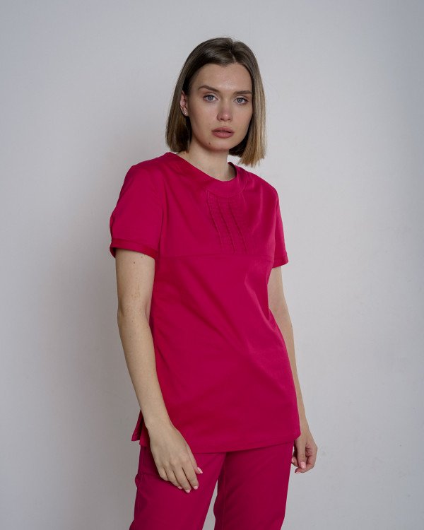 Женский хирургический топ полуприлегающего силуэта с малой прибавкой на облегание. Перед с кокеткой, с настроченными бантовыми складками, с притачной круглой горловиной. Спинка со средним и рельефными швами, с окантованной горловиной, застегивающуюся на навесную и пуговицу. Рукава с притачной манжетой, встречными складками по центру низа рукава.