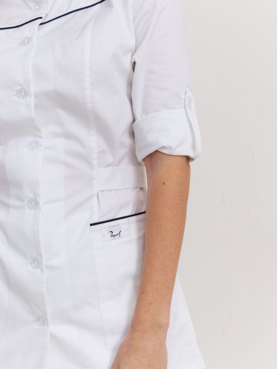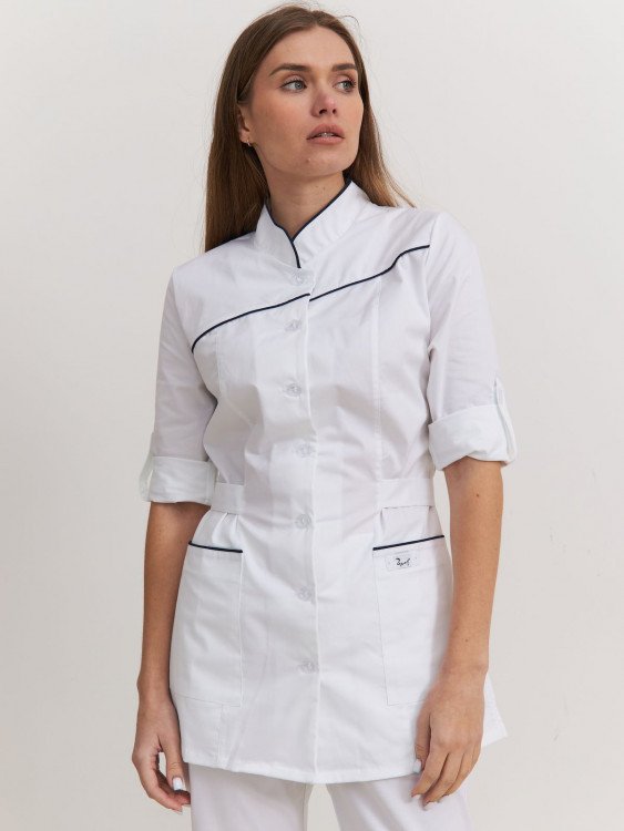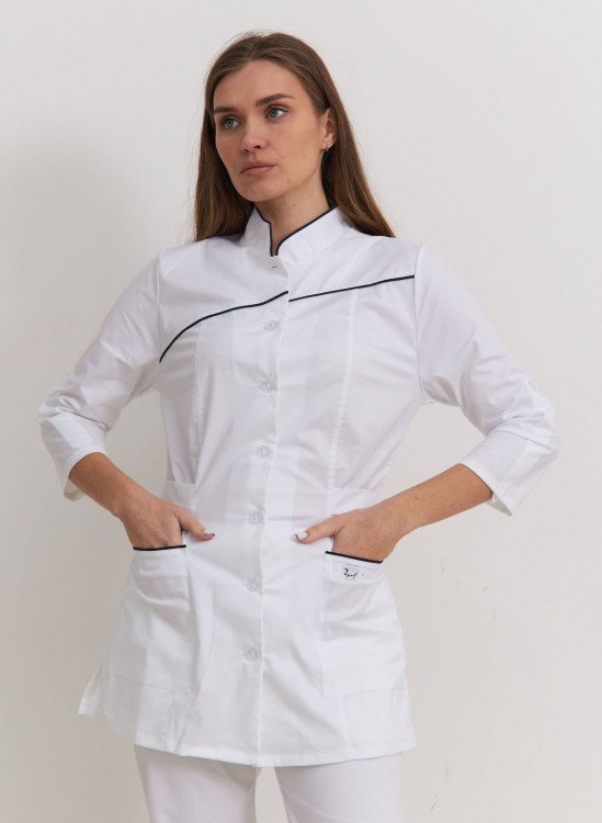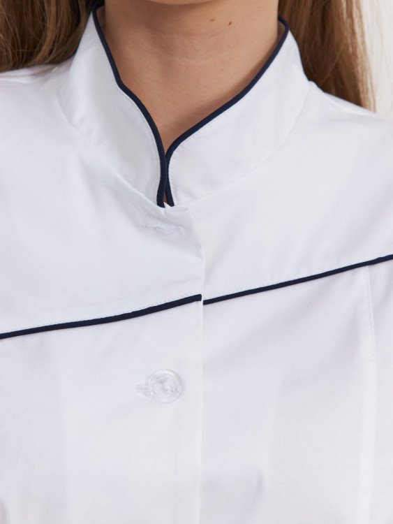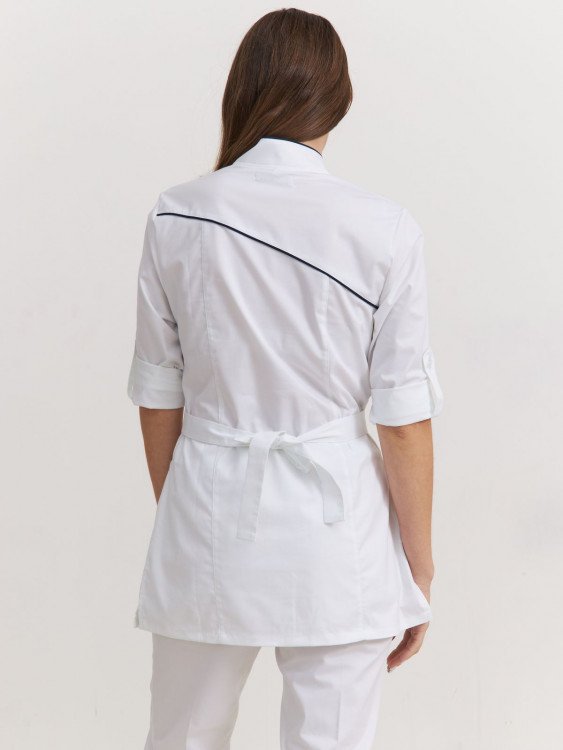 Женский хирургический топ полуприлегающего силуэта с малой прибавкой на облегание. Перед с кокеткой, с настроченными бантовыми складками, с притачной круглой горловиной. Спинка со средним и рельефными швами, с окантованной горловиной, застегивающуюся на навесную и пуговицу. Рукава с притачной манжетой, встречными складками по центру низа рукава.