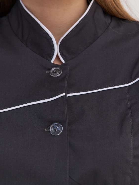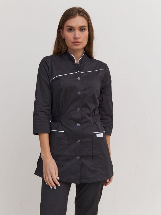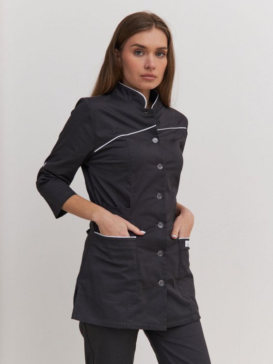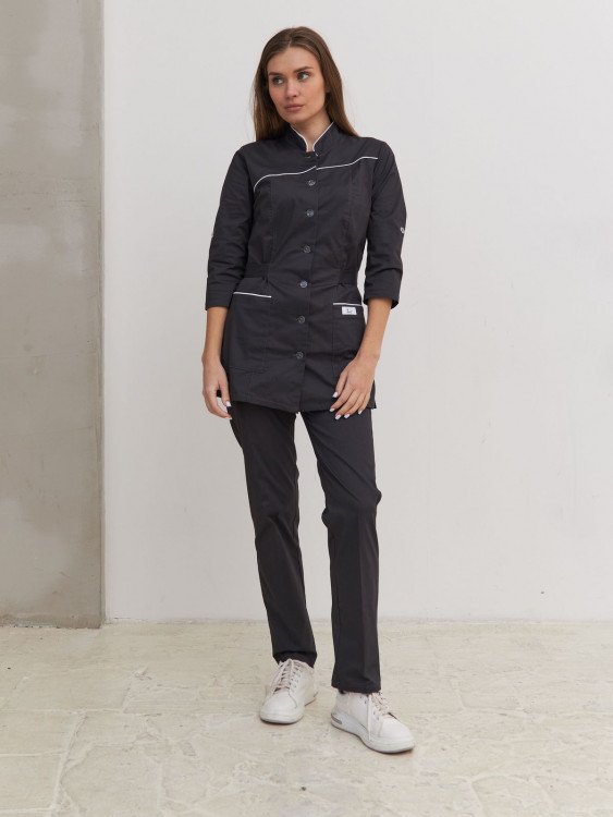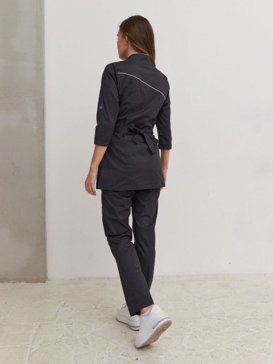 Женский хирургический топ полуприлегающего силуэта с малой прибавкой на облегание. Перед с кокеткой, с настроченными бантовыми складками, с притачной круглой горловиной. Спинка со средним и рельефными швами, с окантованной горловиной, застегивающуюся на навесную и пуговицу. Рукава с притачной манжетой, встречными складками по центру низа рукава.