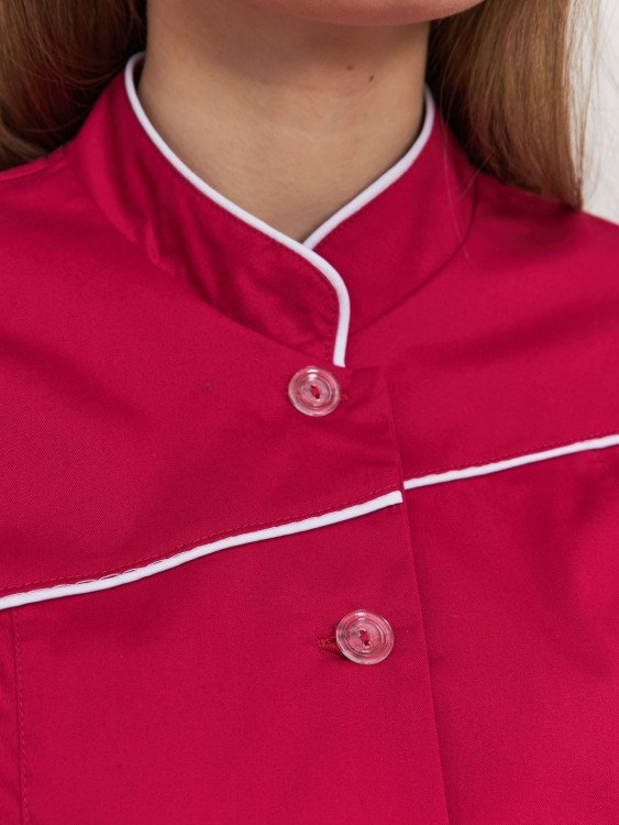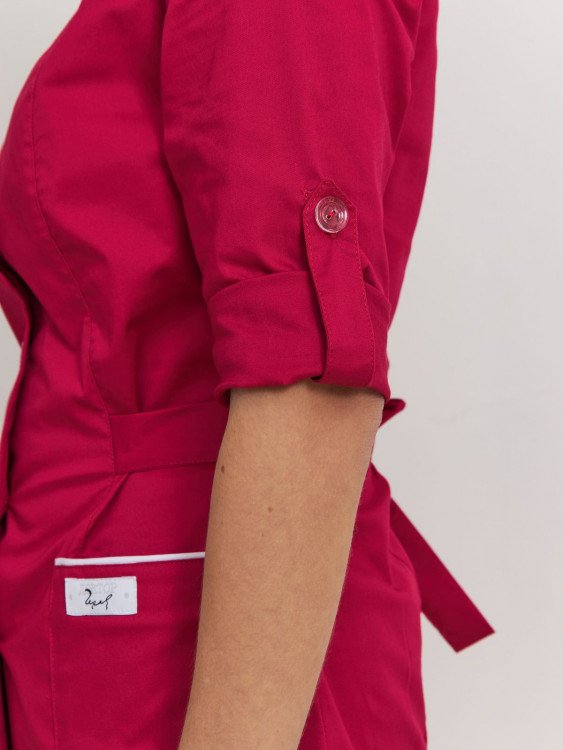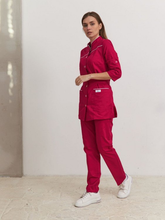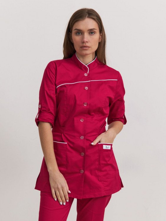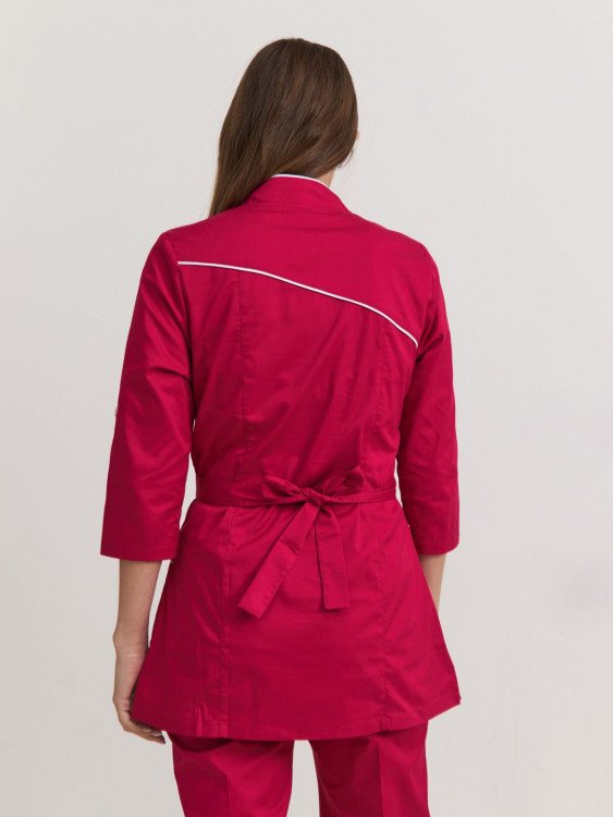 Женский хирургический топ полуприлегающего силуэта с малой прибавкой на облегание. Перед с кокеткой, с настроченными бантовыми складками, с притачной круглой горловиной. Спинка со средним и рельефными швами, с окантованной горловиной, застегивающуюся на навесную и пуговицу. Рукава с притачной манжетой, встречными складками по центру низа рукава.
