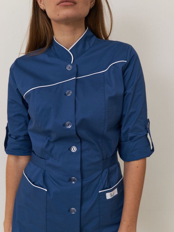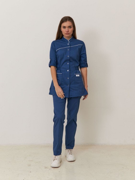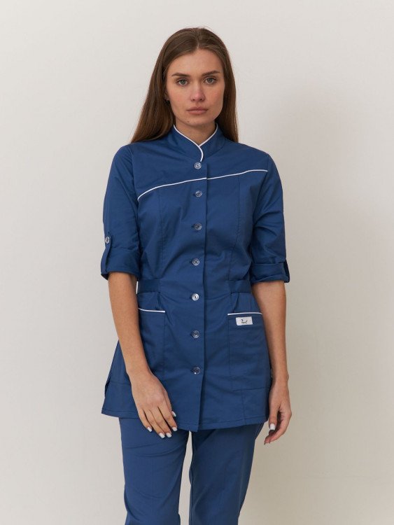 Женский хирургический топ полуприлегающего силуэта с малой прибавкой на облегание. Перед с кокеткой, с настроченными бантовыми складками, с притачной круглой горловиной. Спинка со средним и рельефными швами, с окантованной горловиной, застегивающуюся на навесную и пуговицу. Рукава с притачной манжетой, встречными складками по центру низа рукава.