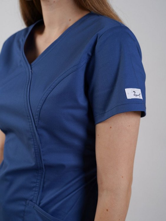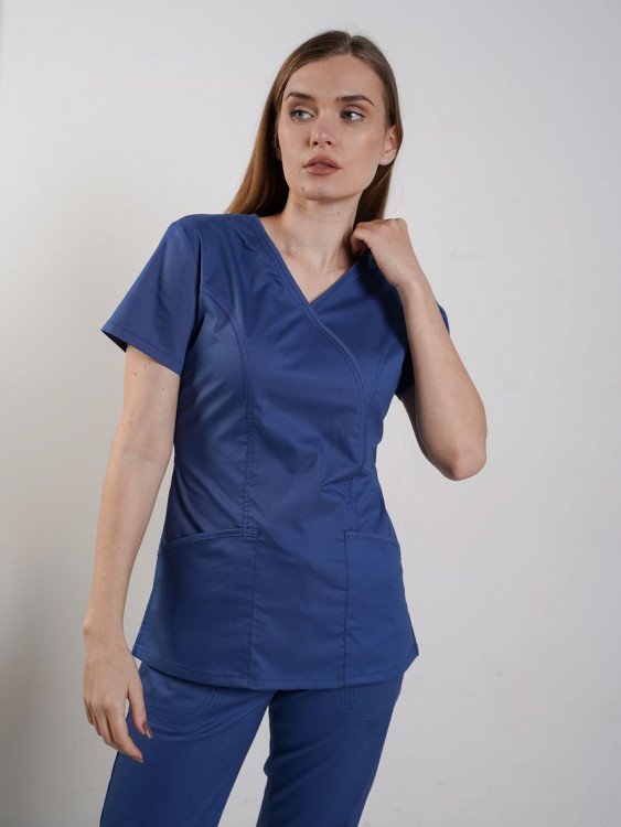 Топ женского медицинского костюма с короткими рукавами и с разрезами в низу боковых швов. Перед с имитацией запахнутого кимоно и с накладными боковыми карманами. Спинка регулируется эластичной тесьмой. Ткань с добавлением эластана.