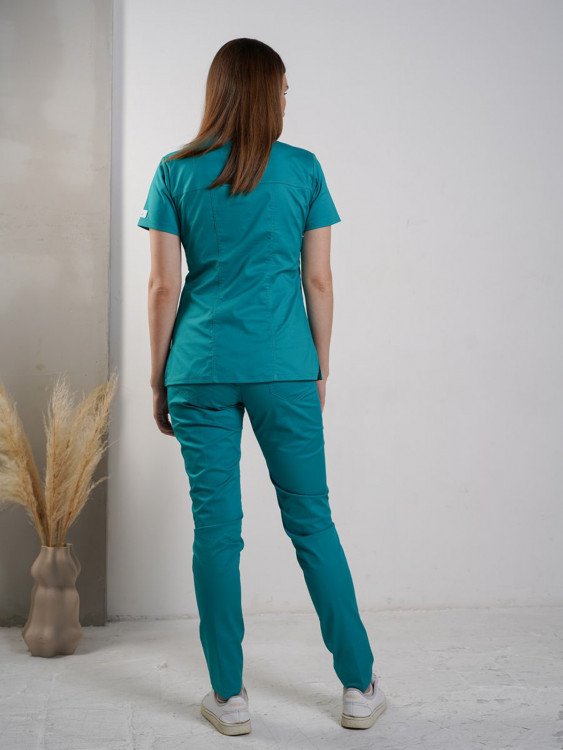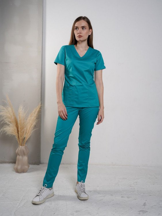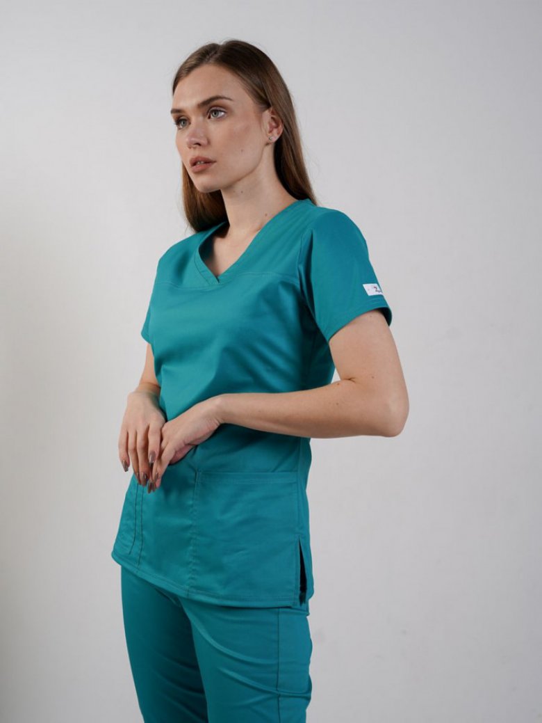 Топ женского хирургического костюма с короткими рукавами и с разрезами внизу боковых швов. Перед с V-образным воротом, с кокетками и накладными боковыми карманами. Спинка с рельефными швами и кокеткой. Ткань с добавлением эластана.