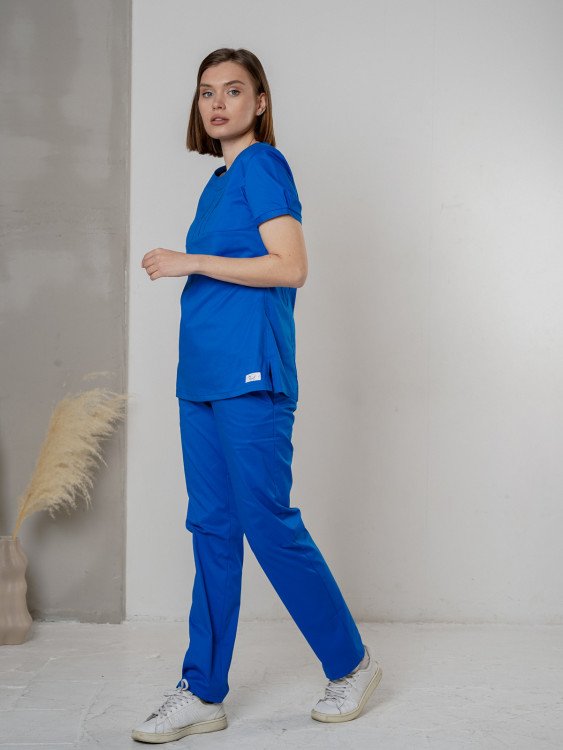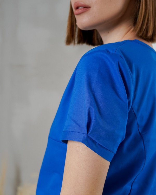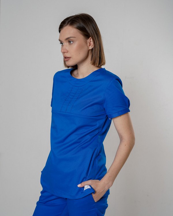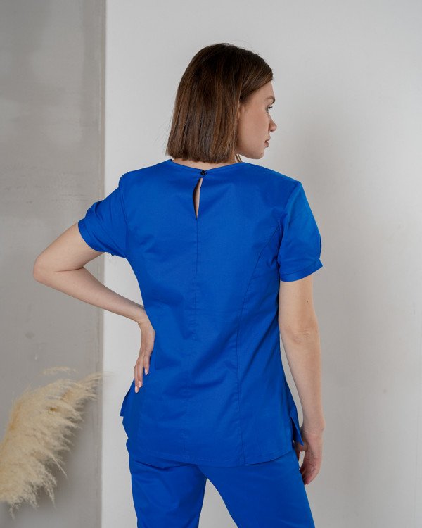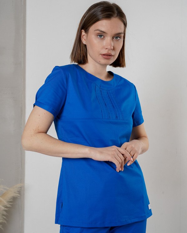 Женский хирургический топ полуприлегающего силуэта с малой прибавкой на облегание. Перед с кокеткой, с настроченными бантовыми складками, с притачной круглой горловиной. Спинка со средним и рельефными швами, с окантованной горловиной, застегивающуюся на навесную и пуговицу. Рукава с притачной манжетой, встречными складками по центру низа рукава.
