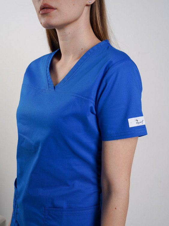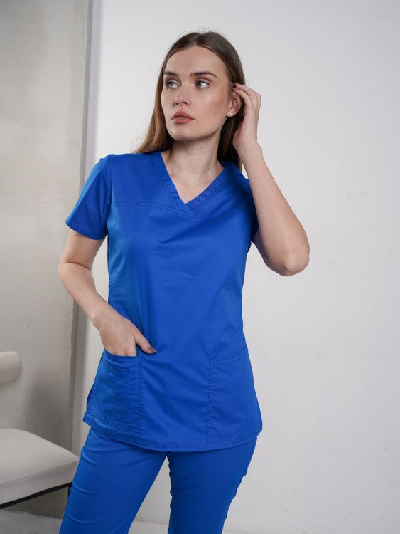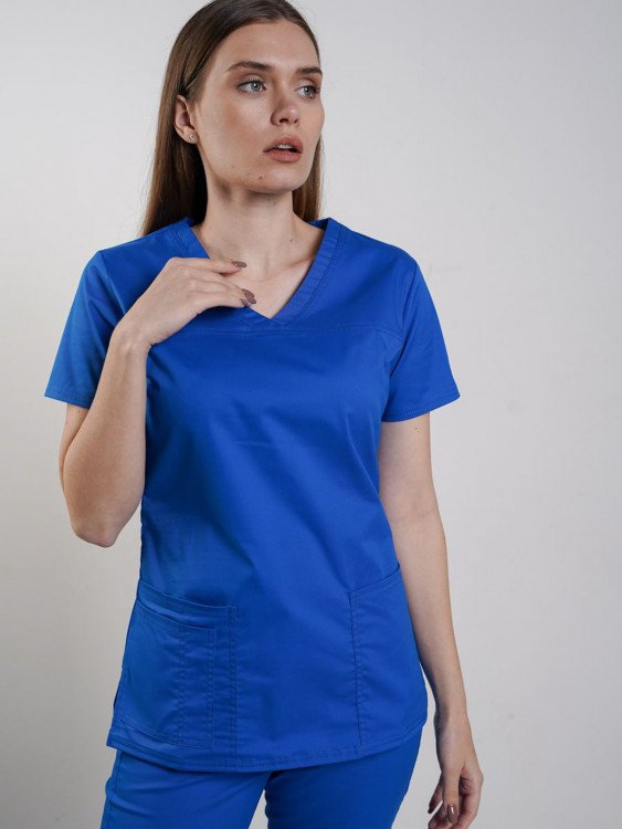 Топ женского хирургического костюма с короткими рукавами и с разрезами внизу боковых швов. Перед с V-образным воротом, с кокетками и накладными боковыми карманами. Спинка с рельефными швами и кокеткой. Ткань с добавлением эластана.
