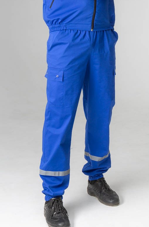 Брюки-джоггеры прямые: пояс на резинке, 2 косых боковых кармана и 2 накладных кармана с клапанами по бокам на уровне бедра, низ брюк собран на эластичную ленту. Светоотражающая лента 2,5 см проложена по низу брюк.