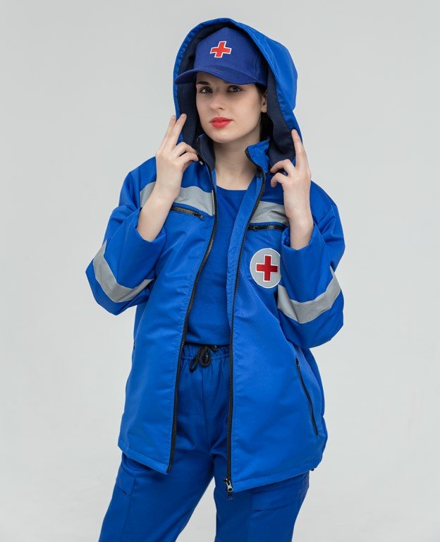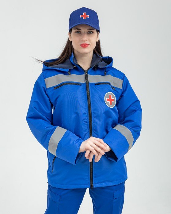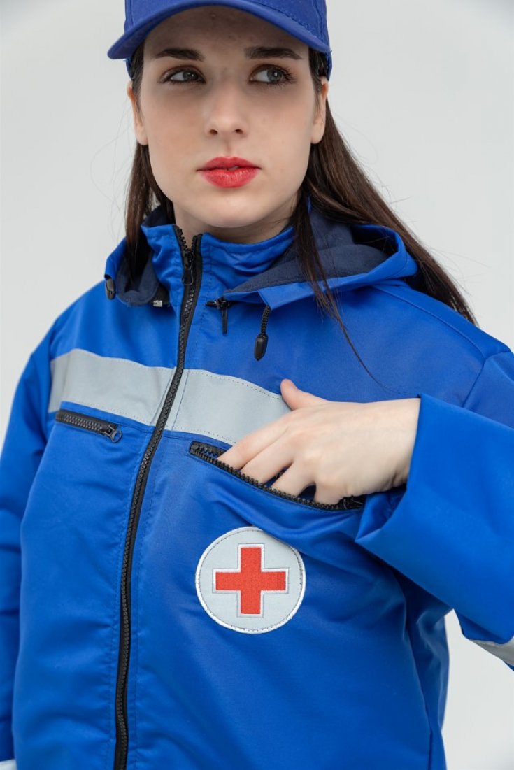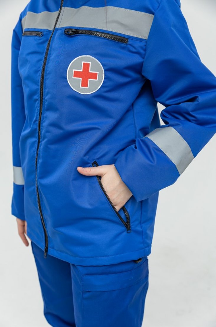 По кокеткам полочек, спинке и рукавам проложена светоотражающая лента 2,5 см.На спине на уровне лопаток расположен шеврон из светоотражающей ткани Скорая помощь.
