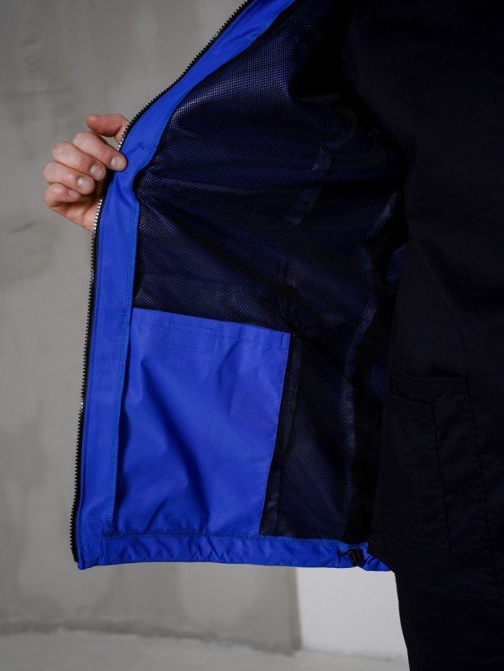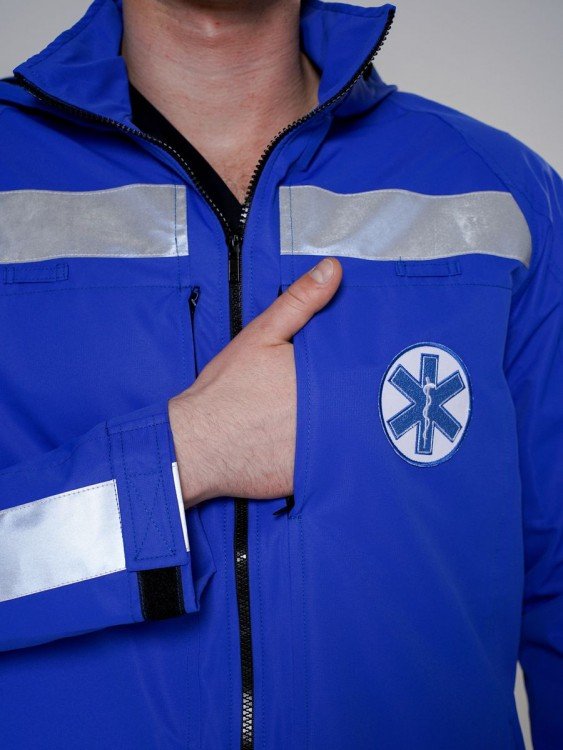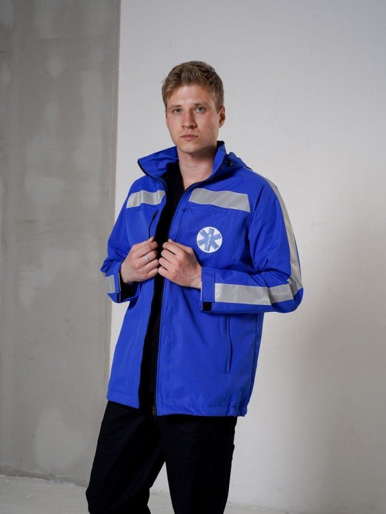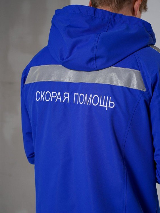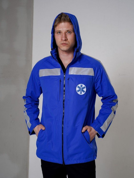 Ветровка летняя Скорая Помощь. Застежка центральная на молнию с ветрозащитной планкой. Капюшон цельнокроеный с козырьком. Регулировка ширины в двух плоскостях за счет кулисы. Карманы куртки на молниях - на животе, потайные на груди. Два внутренних кармана на липучке. Регулирование куртки по ширине за счет кулисы по низу. Светозащитные полосы по ГОСТу. Вентиляция подмышек через пару технологических отверстий.
