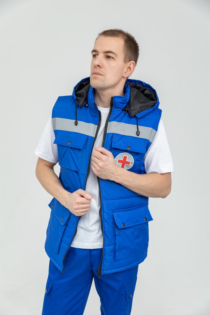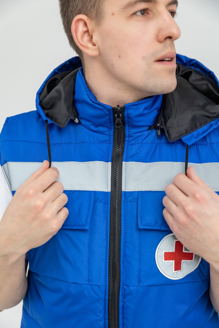 Жилет Скорая помощь имеет полуприлегающий силуэт, воротник стойку и застёжку на надежную двухзамковую молнию. Медицинский жилет Скорая помощь для удобства оснащен 4-мя вместительными накладными карманами с клапаном. Так же имеется удобный скрытый внутренний карман на молнии. На груди шеврон Красный крест и на спине Скорая помощь. Все шевроны выполнены из светоотражающей ткани, нанесение методом вышивки. Светоотражающая лента 5 см.