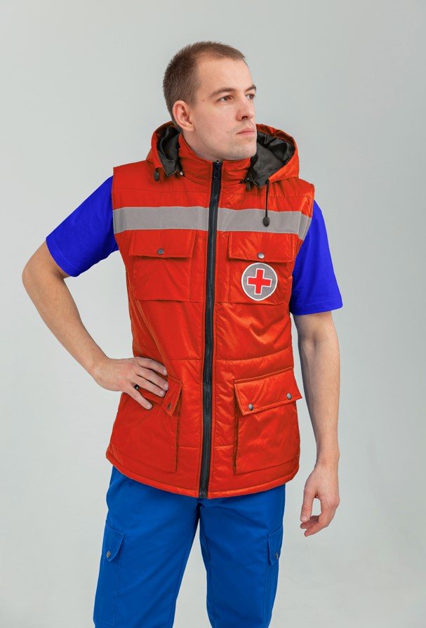 Жилет Скорая помощь имеет полуприлегающий силуэт, воротник стойку и застёжку на надежную двухзамковую молнию. Медицинский жилет Скорая помощь для удобства оснащен 4-мя вместительными накладными карманами с клапаном. Так же имеется удобный скрытый внутренний карман на молнии. На груди шеврон Красный крест и на спине Скорая помощь. Все шевроны выполнены из светоотражающей ткани, нанесение методом вышивки. Светоотражающая лента 5 см.
